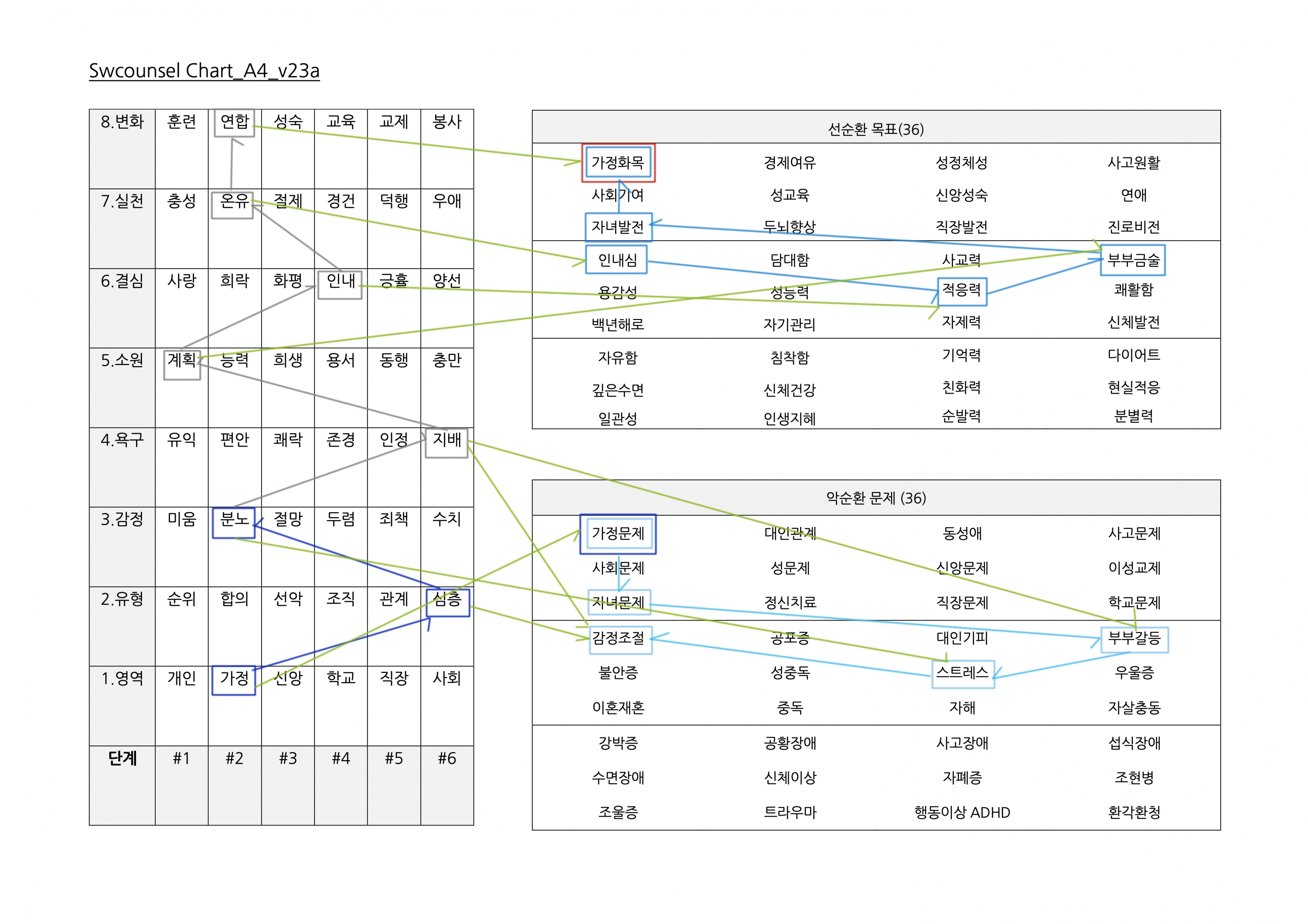3]상담방법1) 사랑하라: 아버지에게 심한말을 듣고 이성을 잃어 분노했던 피상담자를 안타깝게 여기며 상황이 개선될 수 있음을 격려한다.2) 이해하라: 왜 이성을 잃고 아버지에게 분노했는지 이유를 살펴본다.3) 말하라: 분노하게 되었던 이유가 심한말을 들었을 때 낮아지고 싶어하지 않는 존경의 욕구에서 기인한 것임을 말해준다.4) 행하라: (예수님의 희생을 생각하여 적극적인 마음을 갖게 되고) 아버지를 불쌍히 여기어 심한말을 들을 지라도 온유하게 대처하여 성숙한 삶을 살게 한다.5) 확장하라: (예수님의 희생을 생각하여 남들을 위해 피해주지 않으려는 적극적인 마음을 가지다 보면) 아버지를 불쌍히 여기게 되고 심한말을 들을지라도 온유하게 대처하다보니까 성숙한 삶을 살게 된다. 이러한 삶의 패턴은 다른 삶의 부분에서도 동일한 문제가 발생했을 때 이성을 잃고 분노하는 것이 아니라 (예수님의 희생을) 생각하여 타인을 긍휼하게 여기어 선순환을 이룰 수 있음을 깨닫는다.6) 통찰하라: 존경이 아니라 (예수님의 희생을 생각하여 남들을 위해 피해주지 않으려는 적극적인 마음을) 타인에게 적용할때 타인을 긍휼하게 여기게 되고 감정을 조절할 수 있게 됨을 알게 한다.)Ⅱ.문제유형6. 심층유형1) 이해: (가정에서 아버지가 심한말을 했을 때 예수님의 희생을 생각하여 남들을 위해 피해주지 않으려는 마음을 적극적으로 가졌어야 했지만 그것을 알지 못하였다.)2) 사건: 그걸 이해하지 못하니까 가정에서 아버지의 심한말에 대한 자신의 반응으로 괴로워하게 되었다.3) 감정: 그렇게 아버지로부터 심한말을 들었을 때 낮아지고 싶어하지 않는 마음때문에 분노하게 되었다.4) 신체: 그렇게 분노를 하니까 욕을 하게 되고 감정조절이 되지 않아 칼을 들고 싶은 극단적인 충동이 일어나게 되었다.