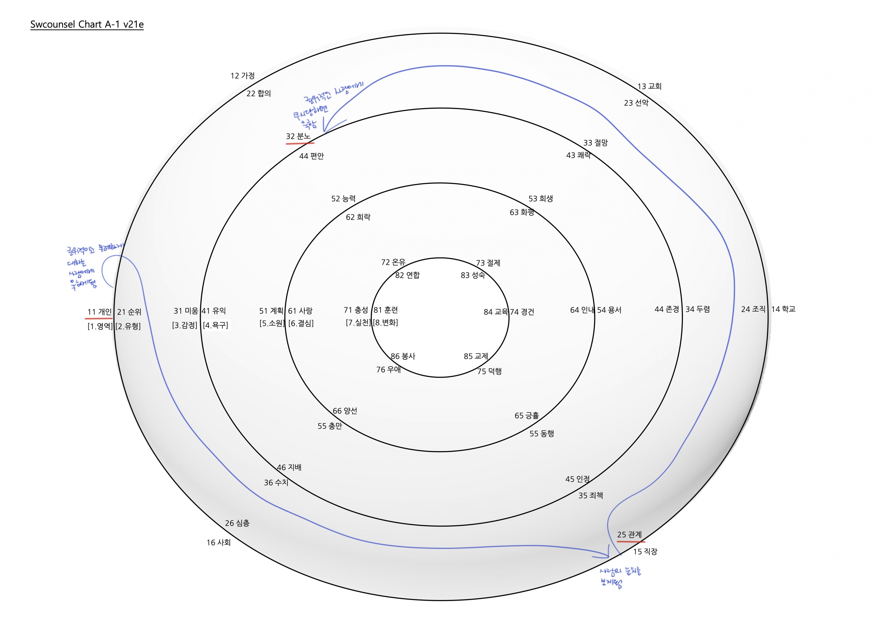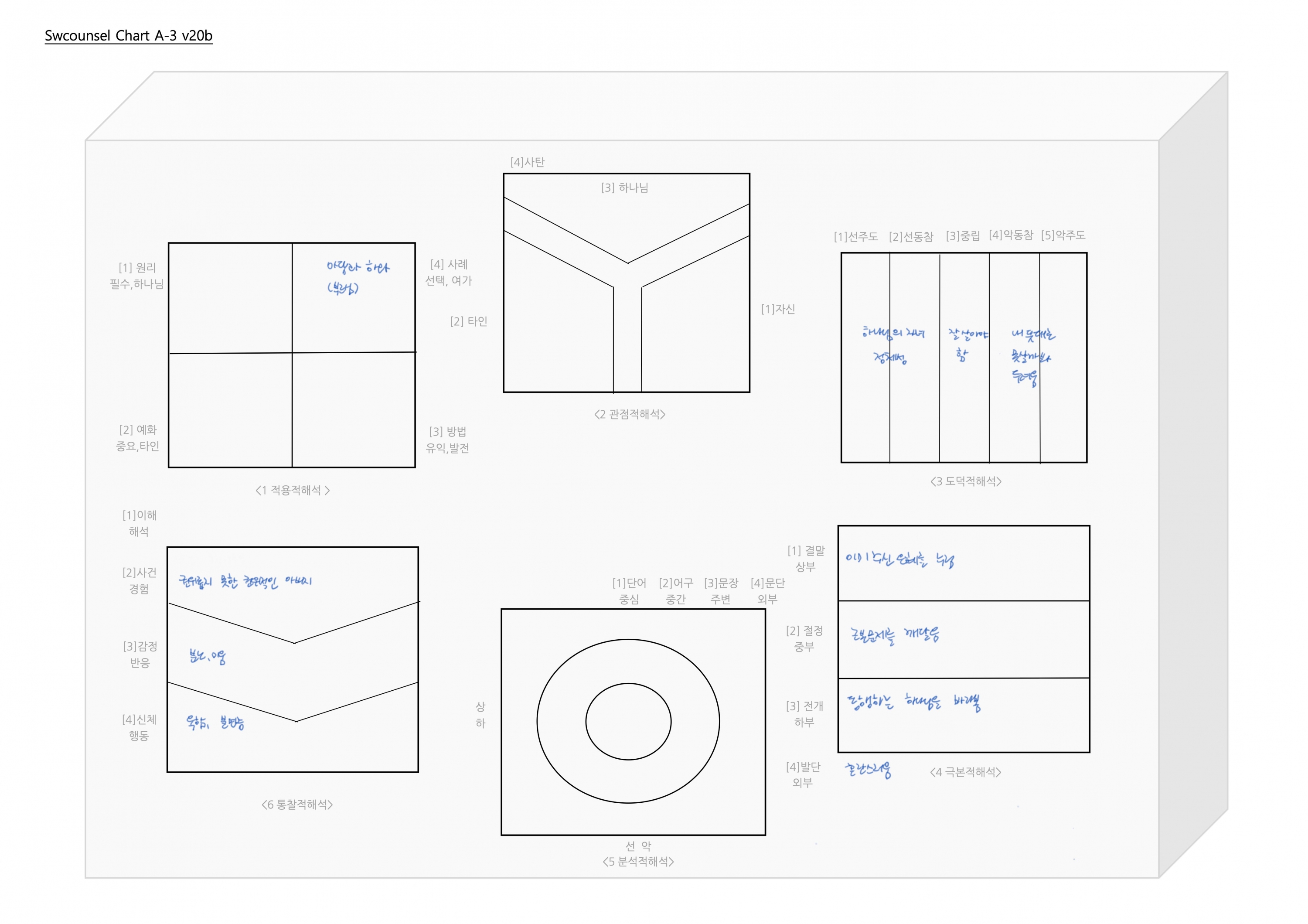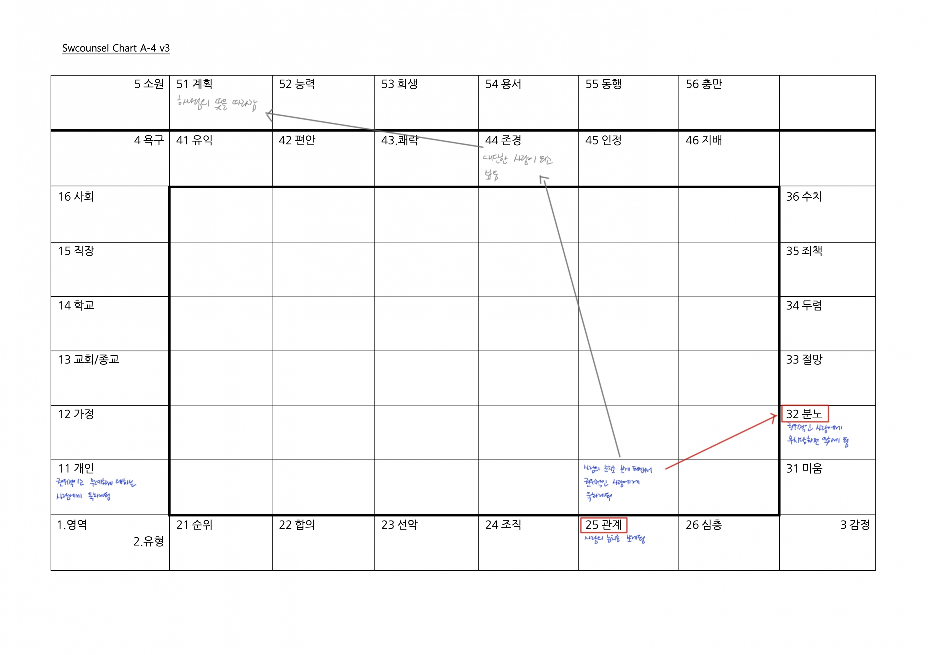 4. 욕구:(편안), 가족의 행복과 자신이 더 단단해지길 바라지만 관계에 에너지를 쓰고 싶지 않고 혼자만의 여가 시간만 누리고 싶은 편안의 욕구.5. 소원:(충만), 주위를 둘러봤을 때 오래 전부터 지금까지 자신을 사랑해주고 도와주는 하나님,가족, 친구,교회 분들이 계시고 그분들과의 관계 속에서 감사한 것들이 있음을 붙듦.6. 결심:(화평), 이해되지 않는 상황과 관계를 접할 때 화평.