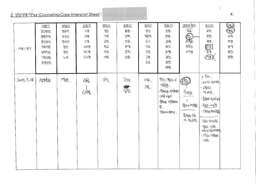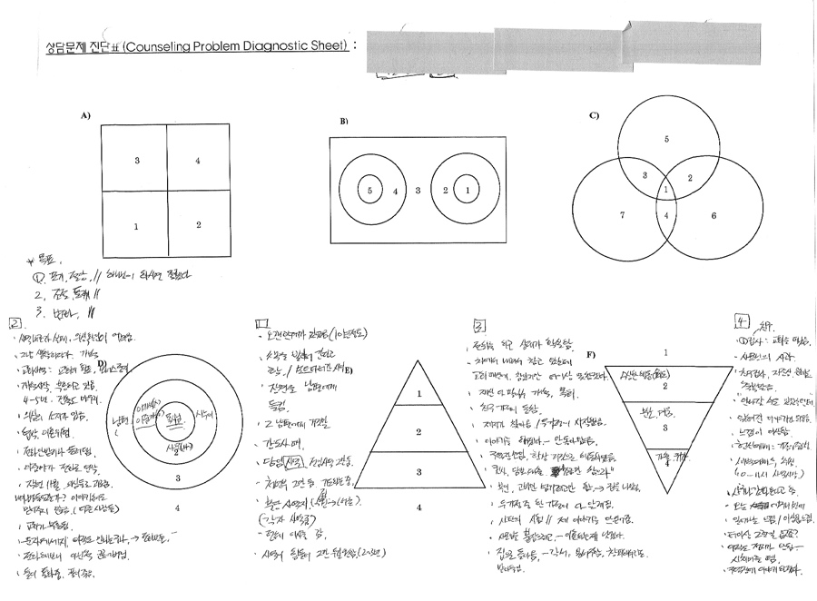 Ⅳ. 상담방법1. 사랑하라: 어린 아기를 키우는 엄마로서 가정을 지키고자하는 마음이 너무나 소중함을 알려주며 그 마음으로 남편과의 갈등문제도 충분히 좋은 방향으로 해결해 나아갈 수 있을 것이라며 소망을 준다.2. 이해하라: 갈등이 되고 있는 남편의 생활습관은 어떤 것들이 있는지와 아내의 산후우울감에 대해 좀 더 깊이 들어본다.3. 설명하라: 남편의 이혼요구가 두려우면서도 합의를 위한 노력을 하지 않는 것은 남편과의 관계에서 낮아지고 싶지 않은 존경의 욕구때문인데 이 욕구를 계획의 은혜 속에서 바라볼 수 있도록 설명한다.4. 실행하라: 계획을 생각하며 이 가정을 바라보니 남편에게 잔소리가 아닌 좀 더 부드럽게 대할 수 있는 마음이 생기며 이 결심으로 다정하게 표현할 수 있도록 실행한다.5. 확장하라: 남편에게 다정하게 대하려고 노력하다보니 남편도 아내를 대하는 태도가 달라지면서 부부사이도 회복되고 점차 일치된 마음으로 자녀와 함께 더욱 연합되어 나가게 됨을 알 수 있도록 확장시킨다.6. 통찰하라: 이 가정을 계획의 은혜 속에서 바라보니 지금 겪는 일들을 바라보는 관점이 달라지면서 남편의 이혼요구에 두려운 감정을 앞세워 이혼대비를 위한 준비를 하는 것이 아니라 합의하고자하는 마음으로 반응하게 됨을 통찰할 수 있도록 한다.Ⅴ.문제유형2.합의유형 1) 자신: 고민자인 아내는 이혼을 원하지 않지만 합의하려는 노력도 없다.2) 타인: 남편은 (계속 아내와 합의가 이루어지지 않자 이혼하자는 말로 자신의 불편한 심기를 드러내고 있다.)3) 하나님: 하나님은 가정이 깨지기를 원치 않으시며 은혜안에서 하나로 연합되기를 바라신다.4) 사탄: 사탄은 부부가 서로의 욕구에 집중해서 합의를 이루지 못하게 하고 가정이 깨지도록 만든다.Ⅵ. 해석답변5. 분석적 해석1) 단어: 아내는 수차례에 걸친 남편의 ”이혼“요구에 실제로 이혼소송이 진행되고 양육권도 뺏기게 될까봐 두려워하고 있다.2) 어구: 아내는 이혼을 언급하게 된 이유가 자신이 ”남편에게 잔소리“하고 요구하는 것이 많아서…