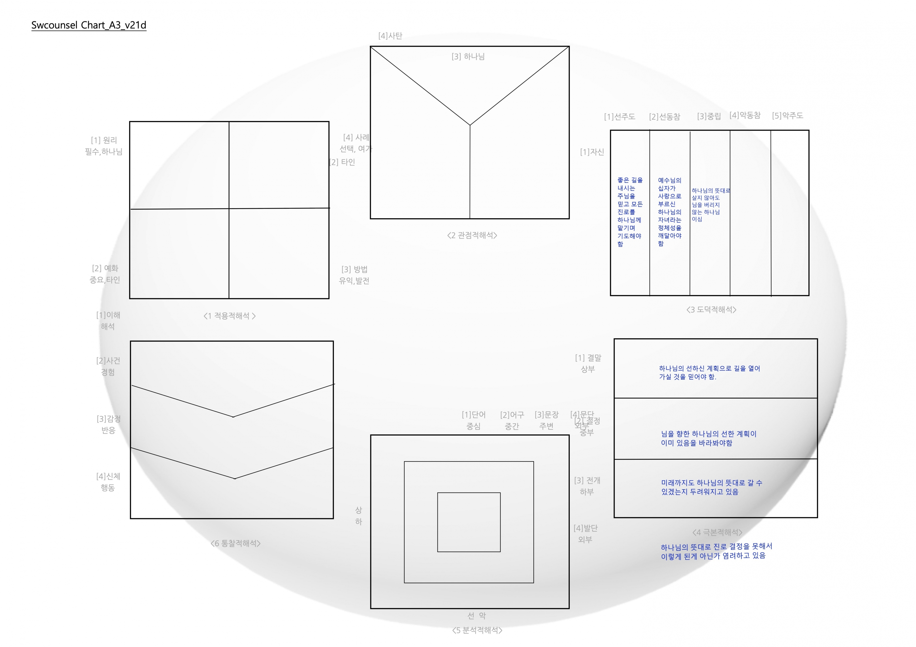 3]. 과정정리1. 문제인식: 직업에 대한 발전 등 적절한 때를 놓친 것 같고 직장에 대한 비전에 없는 등 미래가 잘 보이지 않는 것 같음.2. 원인이해: 선임자가 조언이나 이끌어준게 없다고 생각되어 미운데 이는 유익의 욕구 때문임.3. 방법적용: 하나님이 내게 주신 능력이 있음을 깨달아 이를 활용하고자 하는 마음을 가짐.4. 변화형성: (현재 맡은 일을 충실하게 해나가며 필요한 부분에 대해 교육을 받아 발전을 이룸.)