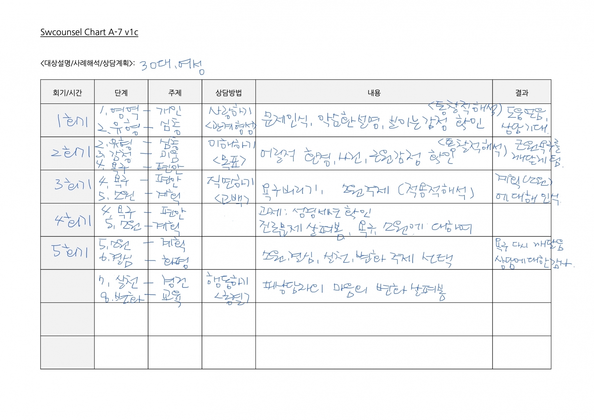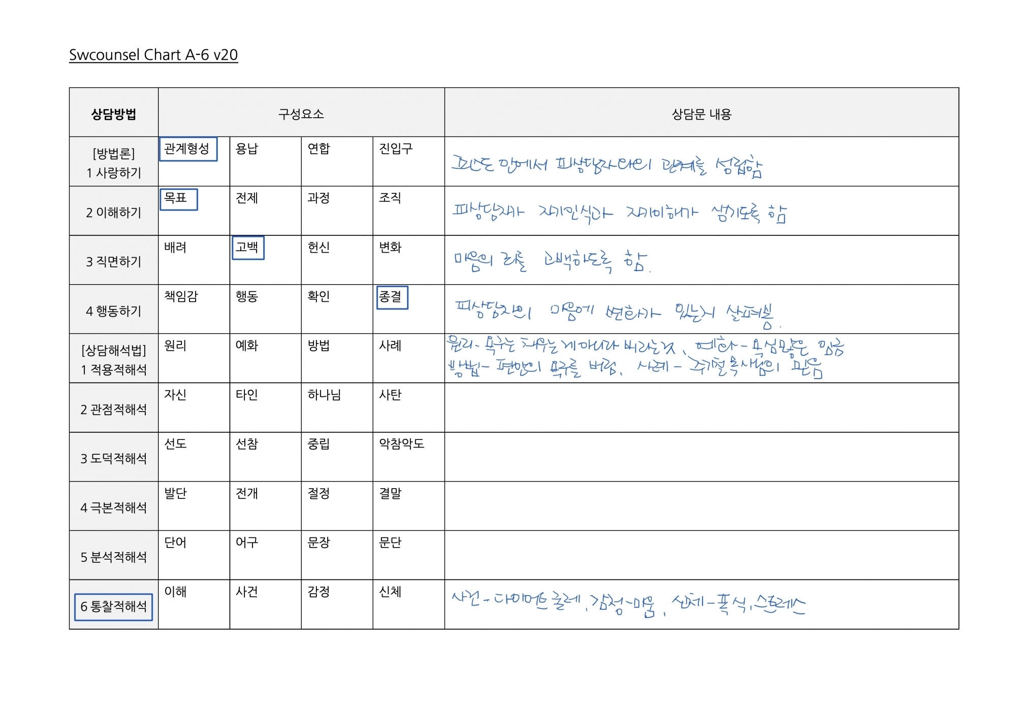 Swcounsel Chart_A0_v240418   연령:   0(영유 )  6(초)     12(중)     15(고)     18(성인)     30대     40대     50대     60대     70대     80대      [1단계 영역] 어떤 영역의 문제로 괴로워하고 있습니까?(문제인식)                       [개인  가정  신앙  학교  직장  사회]   학교 생활 부적응과 학업부진의 괴로움     [2단계 유형] 그 문제의 양상은 어떤 유형에 해당합니까?(문제인식)                        [순위  합의  선악  조직  관계  심층]   쌓여가는 열등감과 우울감으로 고통스런 학교 생활     [3단계 감정] 그 유형이 생기는 원인은 어떤 감정 때문입니까?(원인이해)           [미움  분…