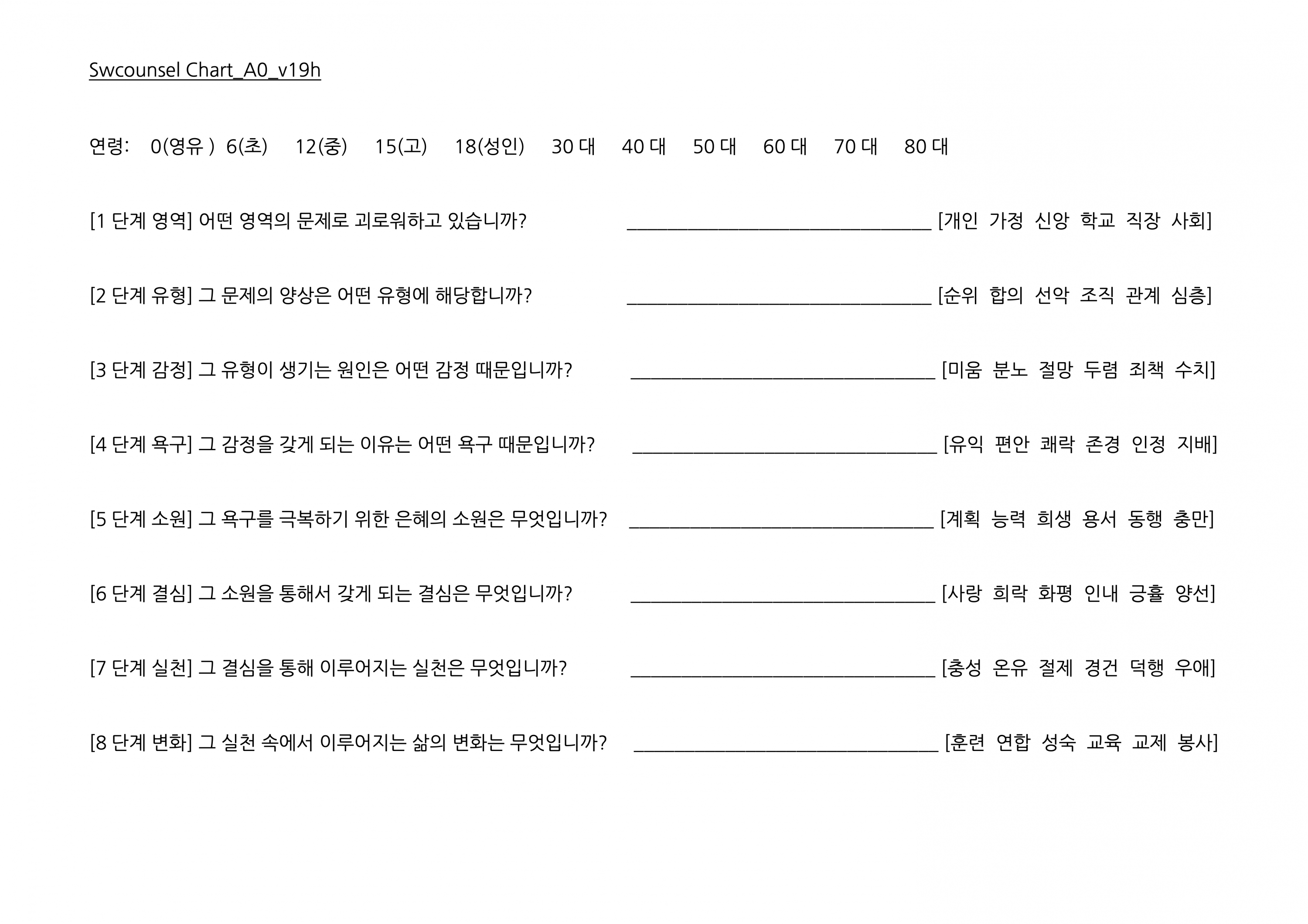 Swcounsel Chart_A0_v240418   연령:   0(영유 )  6(초)     12(중)     15(고)     18(성인)     30대     40대     50대     60대     70대     80대      [1단계 영역] 어떤 영역의 문제로 괴로워하고 있습니까?(문제인식)                       [개인  가정  신앙  학교  직장  사회]   학교 생활 부적응과 학업부진의 괴로움     [2단계 유형] 그 문제의 양상은 어떤 유형에 해당합니까?(문제인식)                        [순위  합의  선악  조직  관계  심층]   쌓여가는 열등감과 우울감으로 고통스런 학교 생활     [3단계 감정] 그 유형이 생기는 원인은 어떤 감정 때문입니까?(원인이해)           [미움  분…