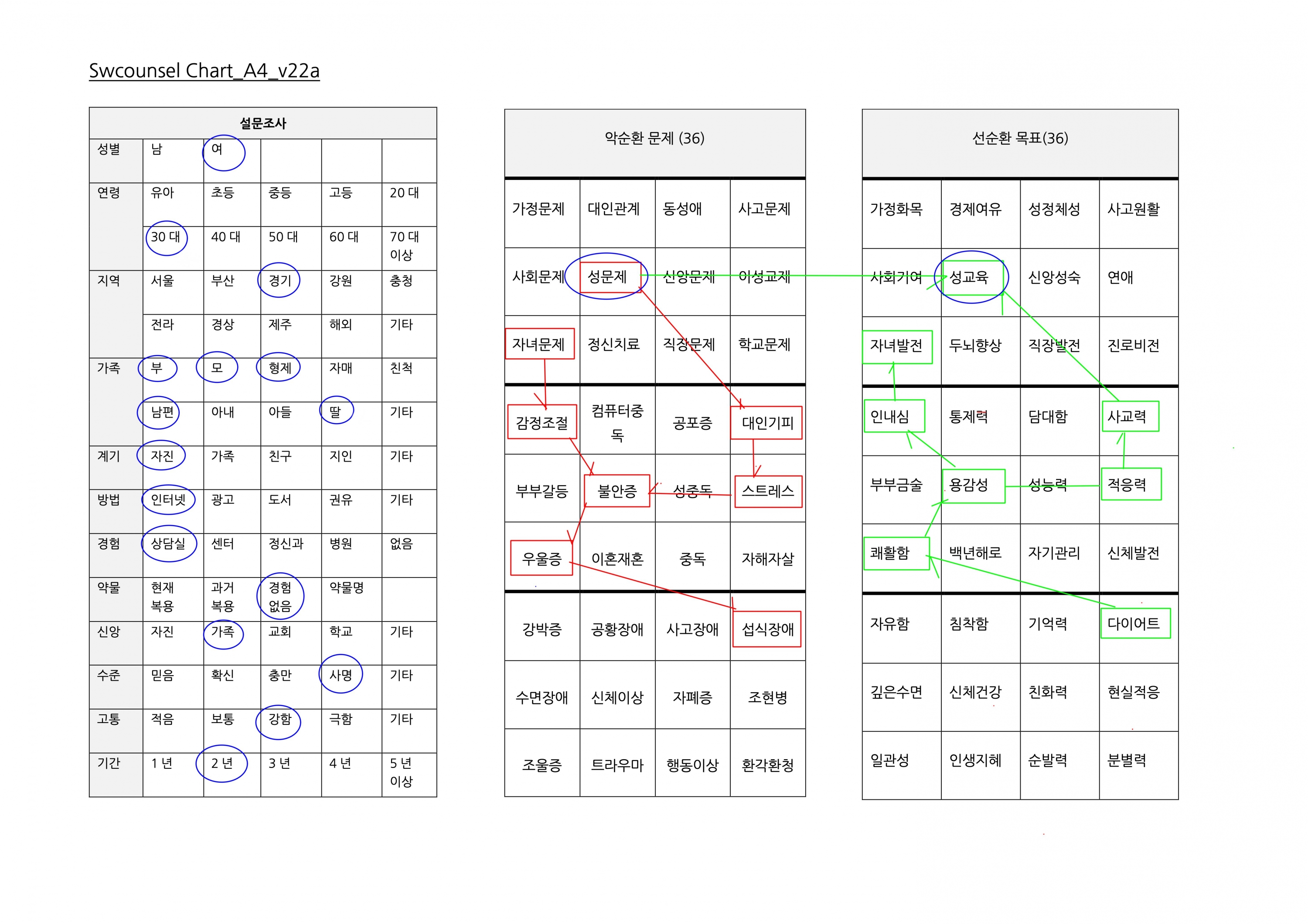 2]사례해석1) 악순환: 과거 훈련소에서 일어났던 일들이 이해되지 않아 자신의 초라한 모습들이 동기들의 의해 폭로될까봐 두려워하여 괴로워 하다보니 감정이 쌓이게 되어 불면증, 우울증, 자살충동과 같은 몸의 문제로 악순환 되었다.2) 선순환: 하나님께서 자신을 용서하시고 앞으로 새로워 질 수 있도록 기회를 주셨음을 알게 될때 훈련소에 일어났던 초라한 자신의 모습이 폭로될까봐 두려워하는게 아니라 앞으로 잘하면 된다는 생각을 하게 되어서 걱정하지 않고 화평한 마음을 가지게 되고 그러다보니까 지속적으로 이런 마음을 훈련하며 살게 된다.3) 진입구: (과거에 매여있지만 그런 상황을 힘들어 하면서 빠져 나오고 싶은 마음이 있으니 그걸 이번에 할 수 있다고 이야기해 준다.)4) 상담방향: 훈련소에서 일어난 일을 이해하지 못하여 낮아진 자신의 모습이 드러날까봐 두려워하는 마음은 자신의 초라한 모습이 폭로되길 바라지 않는 존경의 욕구에서 비롯된 것임을 알게 해준다.5) 상담계획: 존경의 욕구를 버리고 하나님의 용서를 생각하여 자신의 실수한 부분에 대해서 이해를 갖게 될 때 자신의 과거가 밝혀지는 것과 상관없이 평안한 마음을 갖게되어 지속적으로 자신을 용납하게 된다6) 상담목표: ( 하나님의 용서 속에서 더 발전하고 더 잘하게 될 수 있음을 생각하면서 그렇게 훈련되며 살아가게 한다)