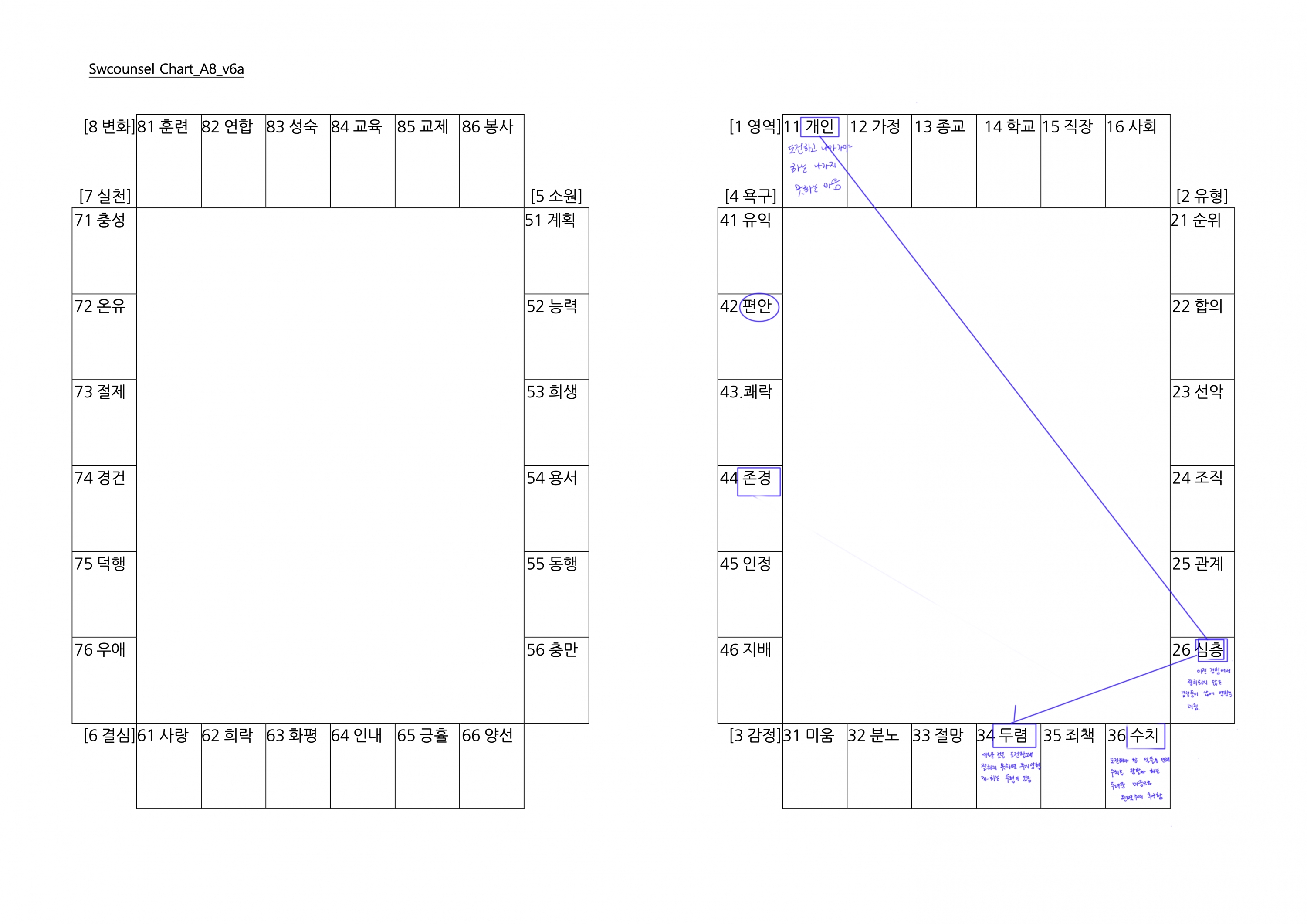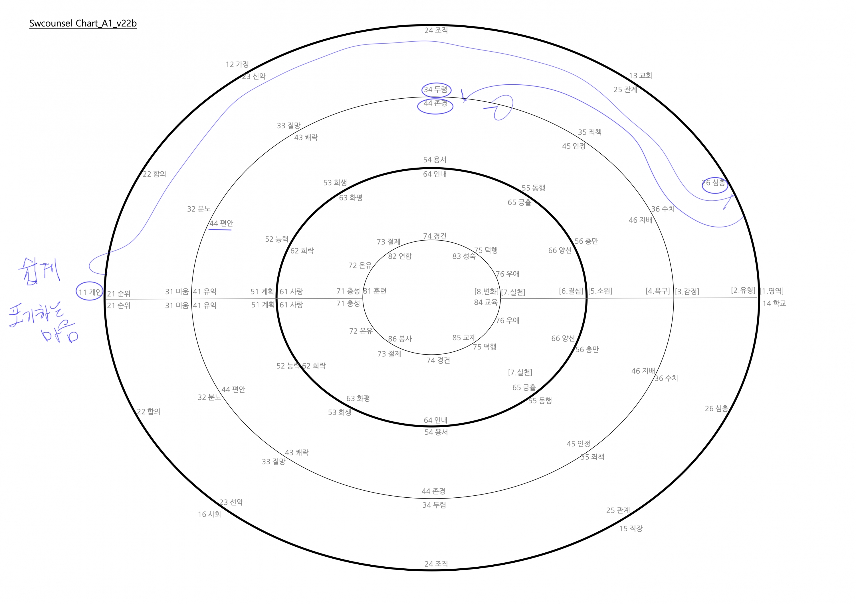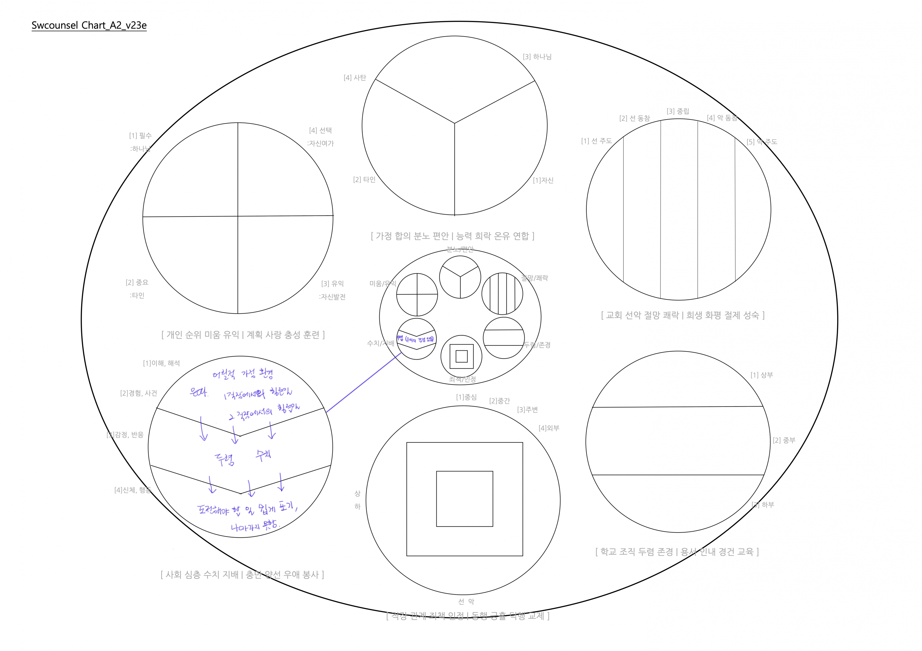 Swcounsel Chart_A0_v240418   연령:   0(영유 )  6(초)     12(중)     15(고)     18(성인)     30대     40대     50대     60대     70대     80대      [1단계 영역] 어떤 영역의 문제로 괴로워하고 있습니까?(문제인식)                       [개인  가정  신앙  학교  직장  사회]   학교 생활 부적응과 학업부진의 괴로움     [2단계 유형] 그 문제의 양상은 어떤 유형에 해당합니까?(문제인식)                        [순위  합의  선악  조직  관계  심층]   쌓여가는 열등감과 우울감으로 고통스런 학교 생활     [3단계 감정] 그 유형이 생기는 원인은 어떤 감정 때문입니까?(원인이해)           [미움  분…