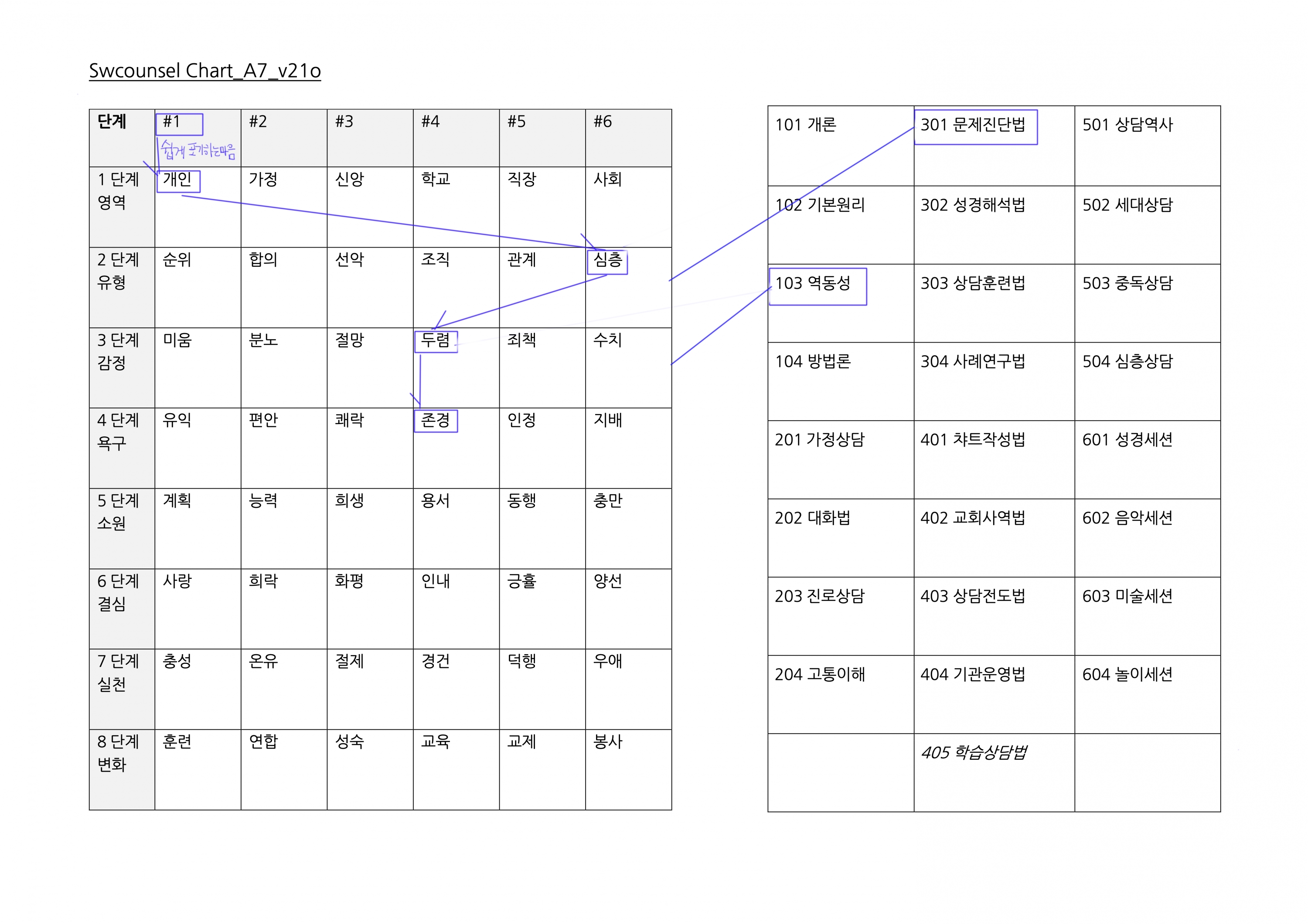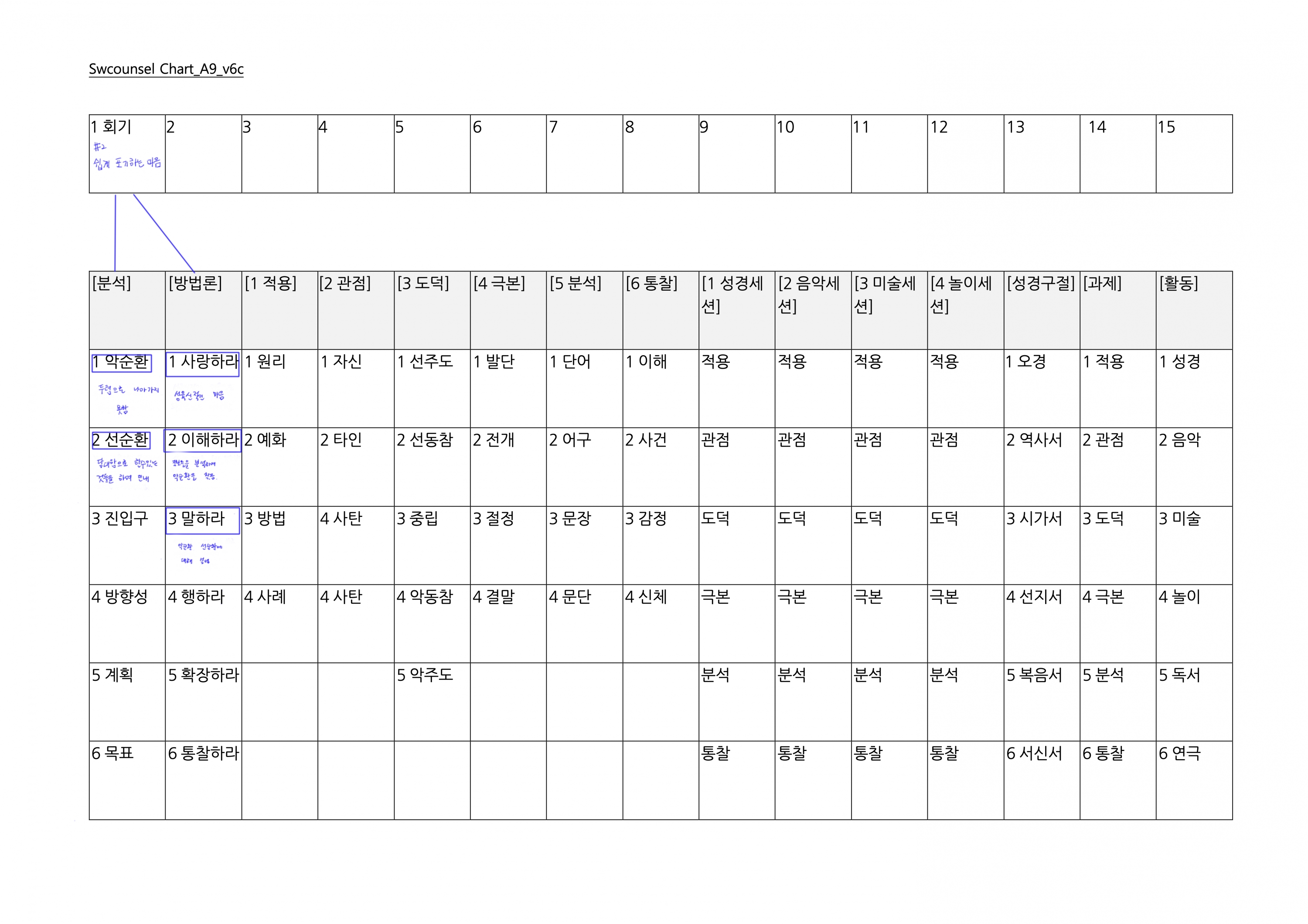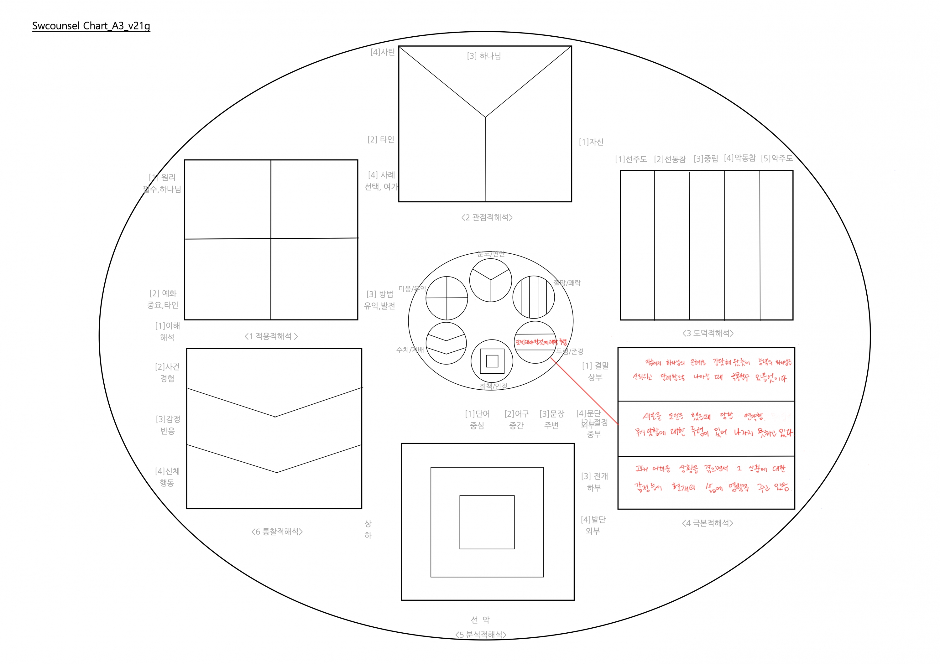 Swcounsel Chart_A0_v240418   연령:   0(영유 )  6(초)     12(중)     15(고)     18(성인)     30대     40대     50대     60대     70대     80대      [1단계 영역] 어떤 영역의 문제로 괴로워하고 있습니까?(문제인식)                       [개인  가정  신앙  학교  직장  사회]   학교 생활 부적응과 학업부진의 괴로움     [2단계 유형] 그 문제의 양상은 어떤 유형에 해당합니까?(문제인식)                        [순위  합의  선악  조직  관계  심층]   쌓여가는 열등감과 우울감으로 고통스런 학교 생활     [3단계 감정] 그 유형이 생기는 원인은 어떤 감정 때문입니까?(원인이해)           [미움  분…