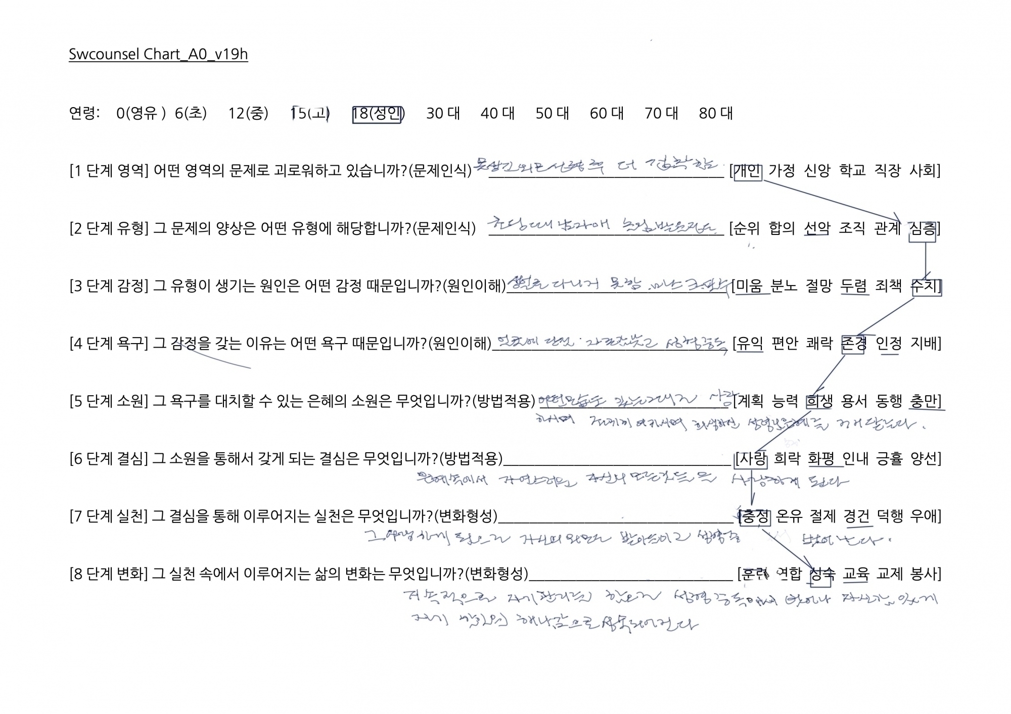 III. 상담방법 1. 사랑하라: (자녀와의 관계를 통해 오랫동안 지속된 부모님과의 안 좋은 마음을 새롭게 하시는 하나님의 뜻을 알려줌) 2. 이해하라: 상대방이 본인을 이해해주지 못하는 상황에서 화가나게 된 계기나 사건을 알아봄.3. 말하라: 관계에서의 일어나는 악순환에서 벗어나기 위해 존중받고 싶어하는 욕구를 버리기를 조언함. 4. 행하라: 하나님이 주신 은혜를 깨닫고 마음이 변화되어 상대방에게 말로써 좋은 영향을 끼칠 수 있도록 격려해 줌.5. 확장하라: (본인과 부모님의 문제를 해결하면 자녀와의 …