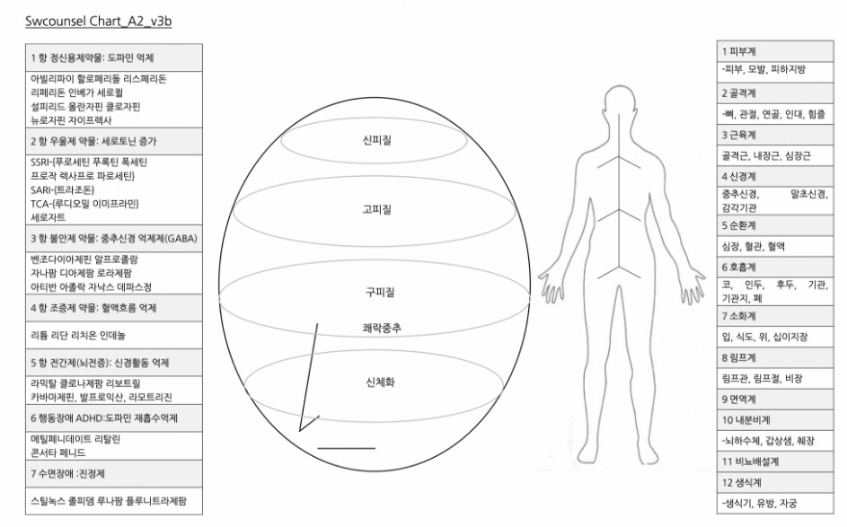 Change0: 전체변화과정챠트- 뇌구조에서 역동성까지 연결되는 마음의 변화과정에 대한 다섯 가지 접근법을 보여주는 상담챠트