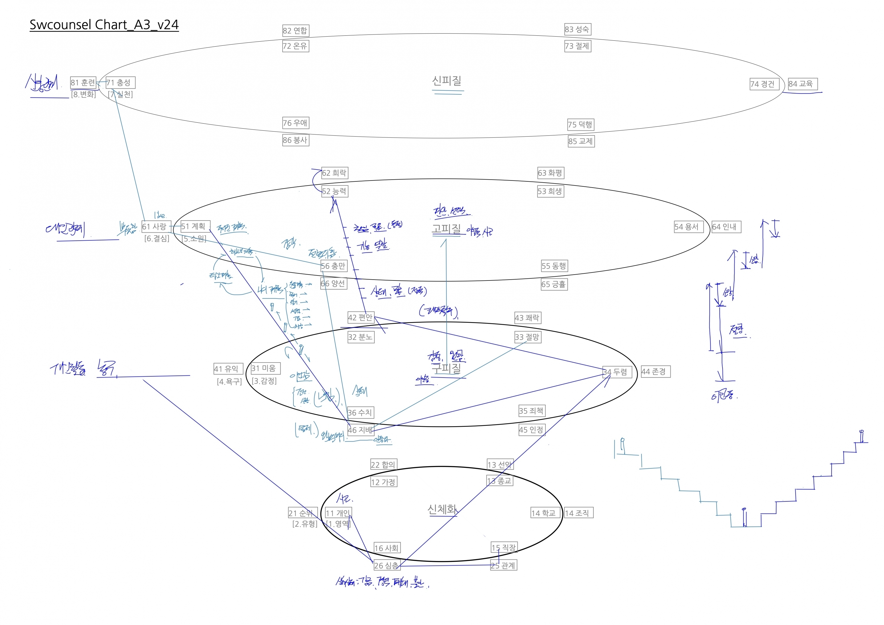 Swcounsel Chart_A0_v240418   연령:   0(영유 )  6(초)     12(중)     15(고)     18(성인)     30대     40대     50대     60대     70대     80대      [1단계 영역] 어떤 영역의 문제로 괴로워하고 있습니까?(문제인식)                       [개인  가정  신앙  학교  직장  사회]   학교 생활 부적응과 학업부진의 괴로움     [2단계 유형] 그 문제의 양상은 어떤 유형에 해당합니까?(문제인식)                        [순위  합의  선악  조직  관계  심층]   쌓여가는 열등감과 우울감으로 고통스런 학교 생활     [3단계 감정] 그 유형이 생기는 원인은 어떤 감정 때문입니까?(원인이해)           [미움  분…
