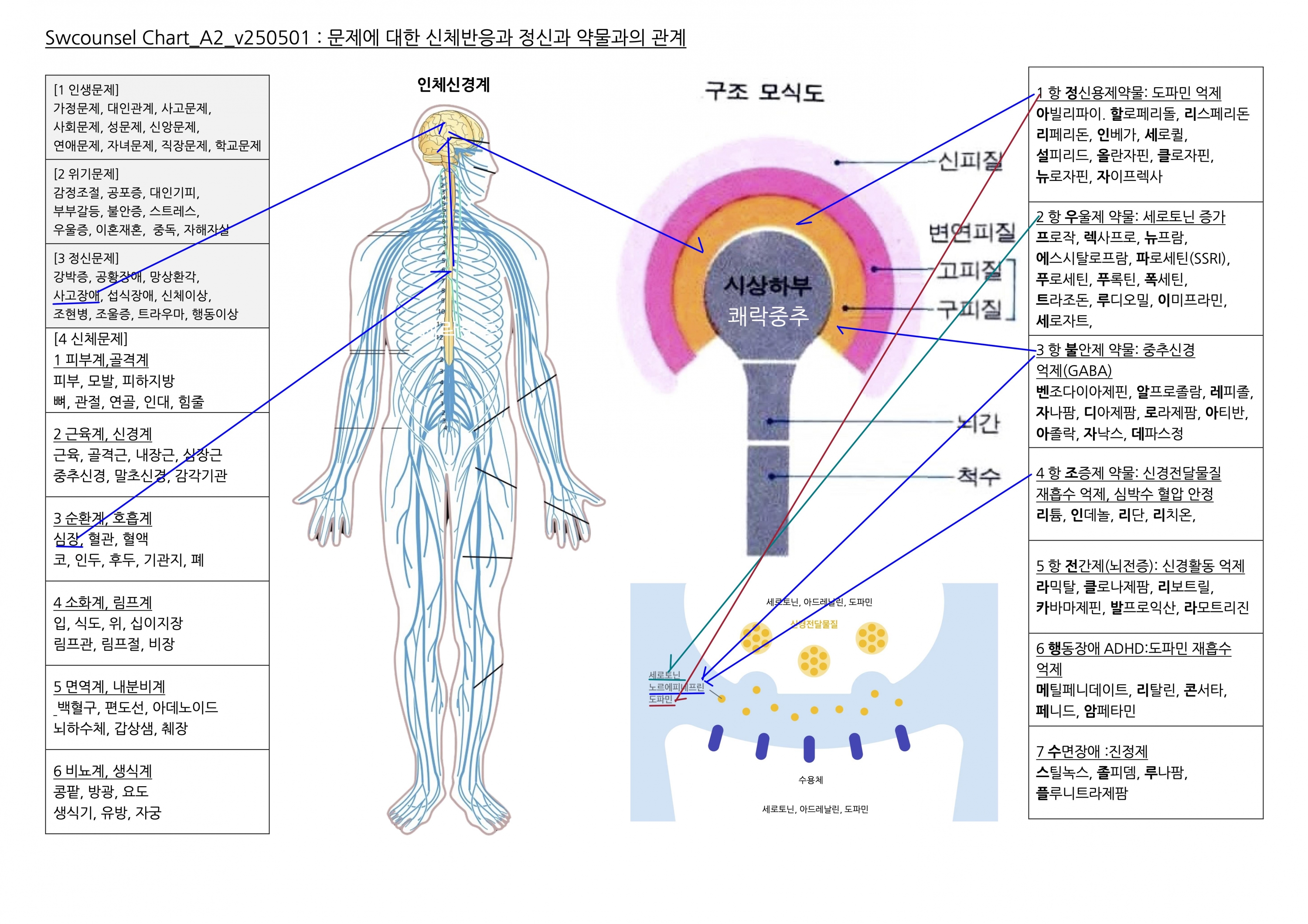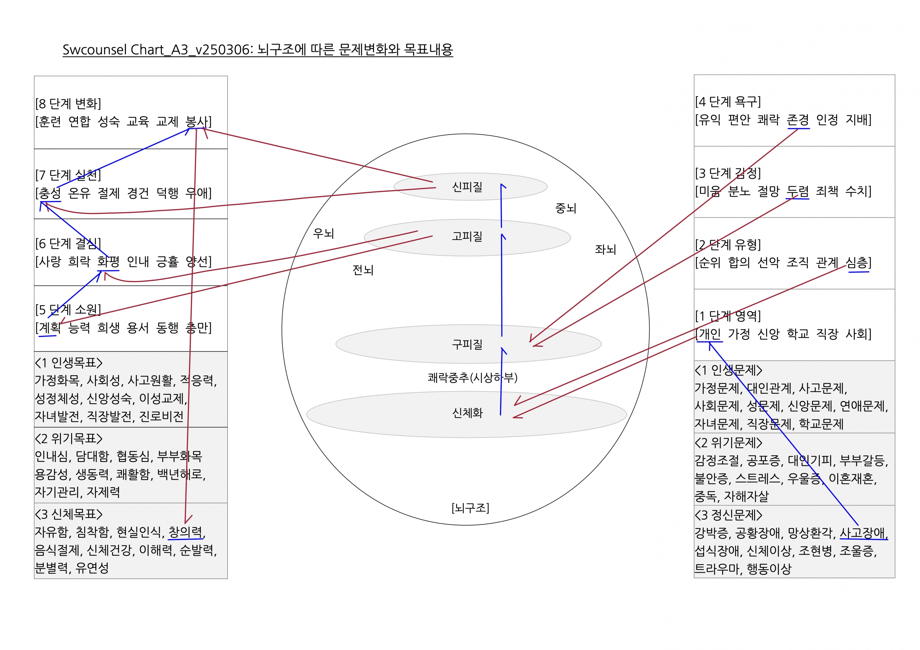 Change0: 전체변화과정챠트- 뇌구조에서 역동성까지 연결되는 마음의 변화과정에 대한 다섯 가지 접근법을 보여주는 상담챠트