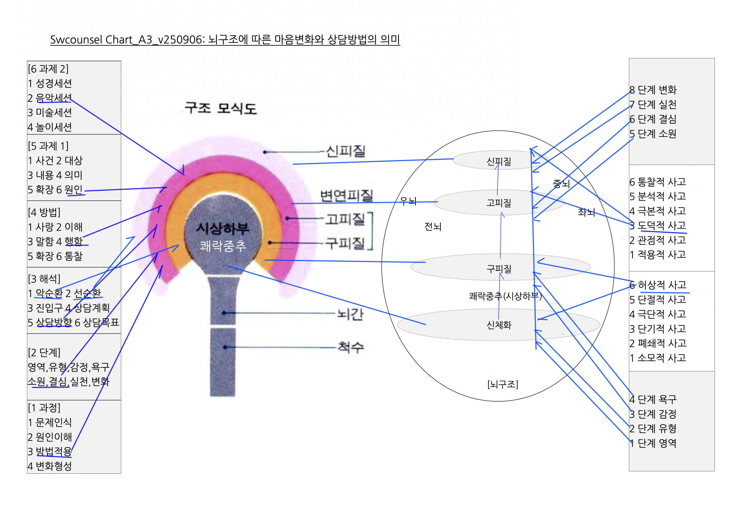 Change0: 전체변화과정챠트- 뇌구조에서 역동성까지 연결되는 마음의 변화과정에 대한 다섯 가지 접근법을 보여주는 상담챠트