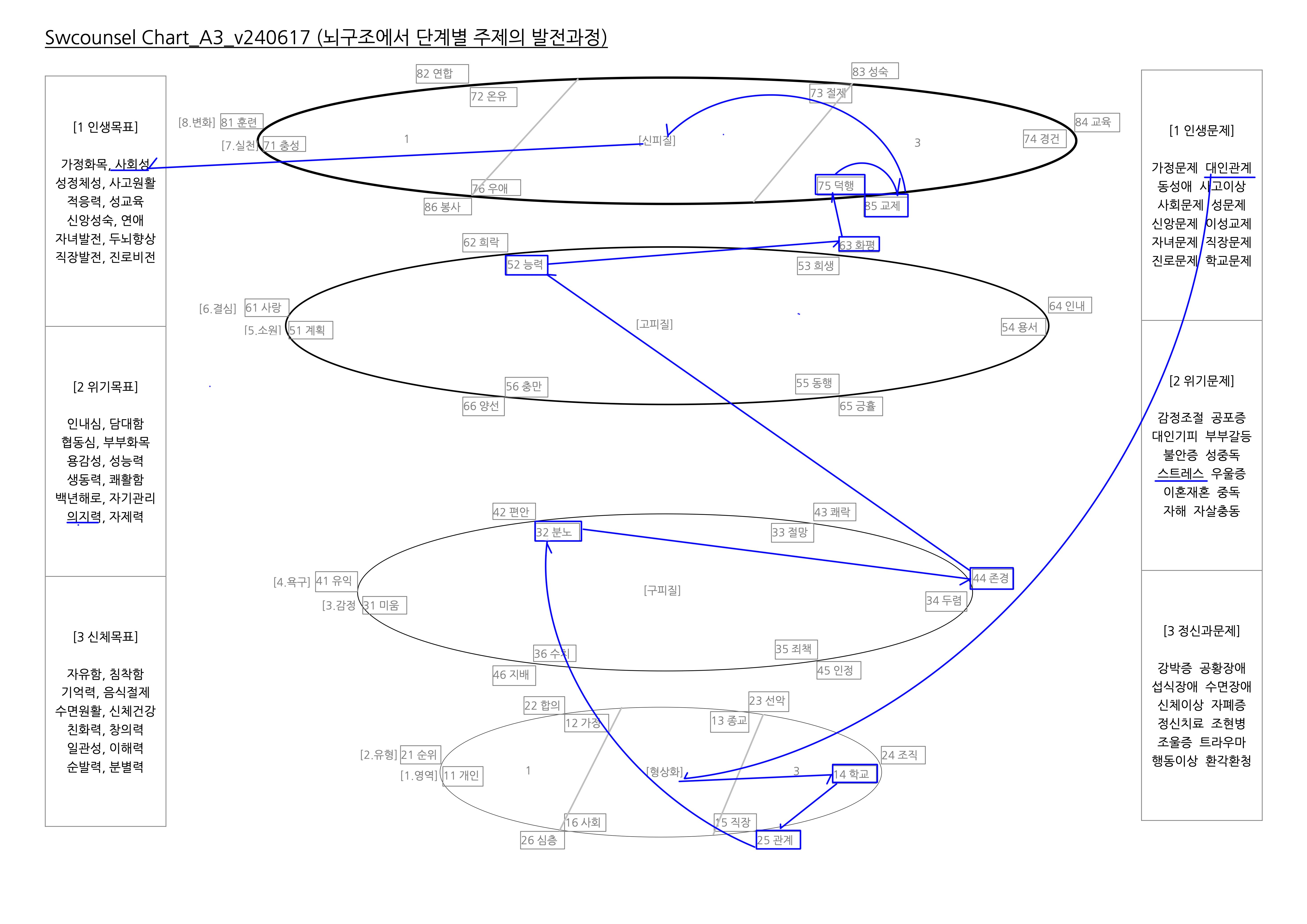 I.단계주제  1. 영역: 가정, 어린 시절부터 가정에서의 삶 힘들었고 현실적인 문제 있어보이는 아빠, 오빠보다 그나마 대화할 수 있는 엄마로 인해 더 힘들어함2. 유형: 선악, 항상 선악에 대한 의식이 있어서 선함으로 나아가려고 하지만 그러지 못해 괴로운 경우가 많음3. 감정: 미움, 자기가 생각하는 옳은 것, 선한 것, 마땅한 것에서 벗어나면 억울하고 절망하게 됨4. 욕구: 편안, 본인의 기준과 생활의 틀에 머무는 것 이외에 모든 것이 불편하게 느껴짐5. 소원: 동행, 힘들 때 나를 도와주고 함께해준 사람들과 하나님을 깨닫고 가족과의 동행, 예수님과의 동행을 소원함6. 결심: 화평, 동행하려는 소원을 할 때 마음의 여러가지 걱정과 감정적인 괴로움이 자연스레 멀어지며 잊혀짐 7. 실천: 절제, 욕구와 소원을 구별하고 목표와 선순환을 의식적으로 떠올리며 그렇게 나아가도록 애쓴다 8. 변화: 교제, 여러가지 불편함과 두려움으로 인해 상대방의 접근을 막던 모습에서 벗아나 사람들과 소통하고 생활함 II.사례해석1. 악순환: 과거부터 계속된 안 좋은 사건들과 그로인한 이해되지 못한 감정들로 인해 불편하게 느껴졌던 엄마를 미워하고 자신이 만든 틀의 정당성에 갖혀서 신앙의 자유함을 잃어버림, 존경 욕구로 인해 대인기피생기고 사람을 두려워 함, 이 모든 것으로 인해 더욱 우울하고 절망함   2. 선순환: 가정에서 엄마와 함께 동행하며, 존경 욕구를 버리고 예수님의 뜻을 따르는 동행을, 신앙적 자유함을 얻기 위해 율법에서 해방시키신 성령님의 동행하심을 더욱 소원함 3. 진입구: 신앙을 의지하려는 마음과 어려움을 성경으로 해석하고 이해하려는 마음, 선으로 나아가고자 하는 마음으로 들어감4. 상담방향: 이제까지 힘들때 도와줬던 사람들, 좋아해줬던 사람들과 그 은혜를 허락하신 하나님을 깨달음 5. 상담계획: 편안하려는 마음을 내려놓고 동행을 소원하게 함6. 상담목표: 가정에서의 인내함을 얻고, 신앙에서의 자유함을 얻고…