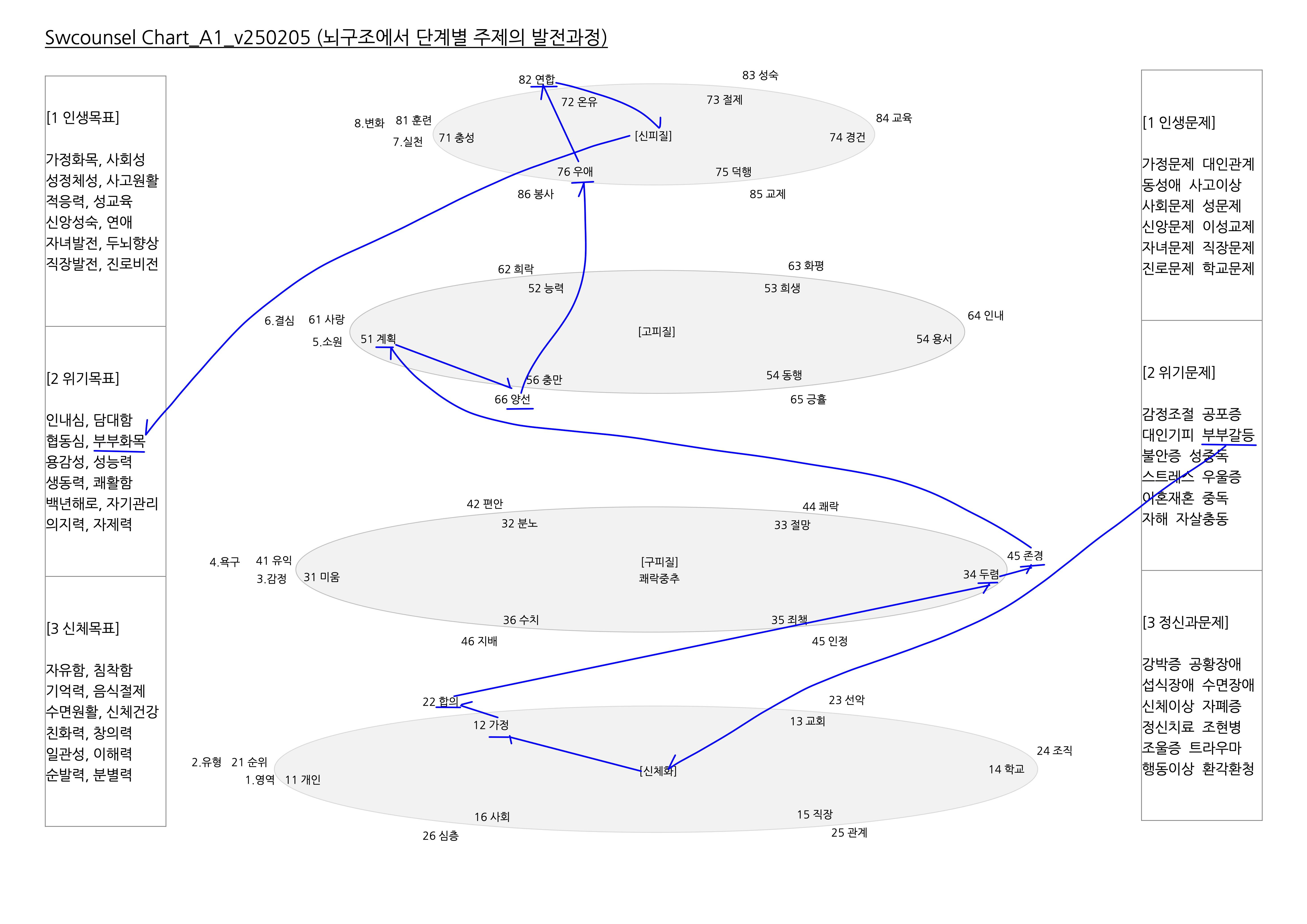 Ⅱ. 단계주제 1. 영역: 가정, 남편과의 갈등과 이혼요구로 괴롭다. 2. 유형: 합의, 이혼을 당하는 것이 싫으면서도 남편과 합의를 하려고 노력하지 않는다. 3. 감정: 두렴, 남편이 이혼소송을 해서 가정도 깨지고 양육권도 박탈당할까봐 두렵다. 4. 욕구: 존경, 남편과의 관계에서 낮아지고 싶지 않은 마음이 있다. 5. 소원: 계획, 자존심을 내려놓고 이 가정을 향한 하나님의 계획을 생각한다. 6. 결심: 양선, 계획을 생각하니 남편과 합의하려는 마음이 생기고 요구와 잔소리가 아닌 좀 더 부드럽게 대하기로 결심한다. 7. 실천: 우애, 남편과 좀 더 친밀해 질 수 있는 시간을 갖으려고 노력한다. 8. 변화: 연합, 남편과 일치된 마음으로 아이와 함께 더욱 견고하게 연합된 가정으로 나아간다.