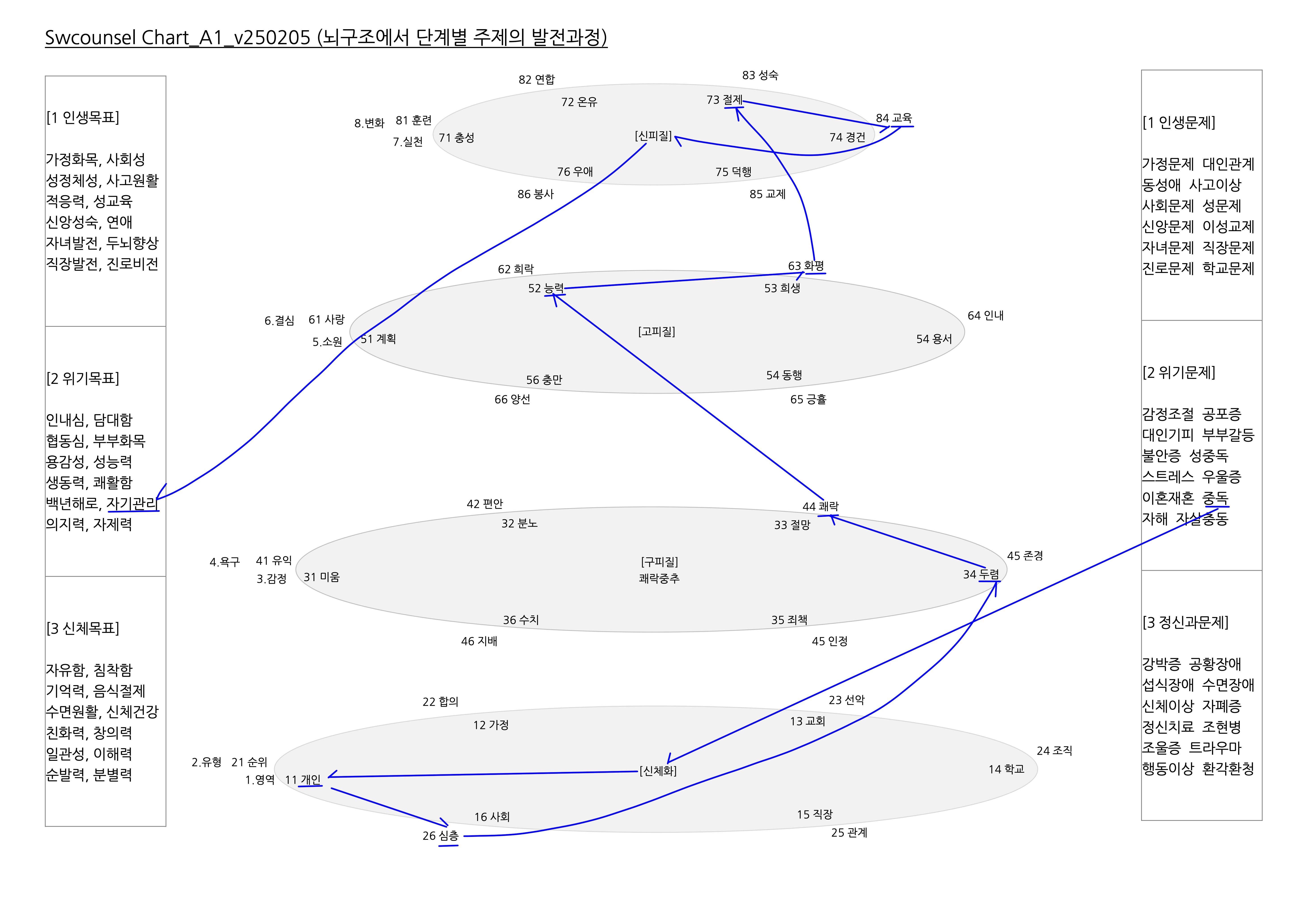 Ⅱ. 단계주제 1. 영역: 개인, 커피를 마시지 않으면 두통이 너무 심해 괴롭다. 2. 유형: 심층, 지나친 커피 섭취로 인해 진통제도 듣지 않는 심한 두통을 겪게 되었다. 3. 감정: 두렴, 두통이 계속 될까봐 두렵다. 4. 욕구: 쾌락, 습관적인 행위를 유지함으로 즐거움을 계속 얻기를 바란다. 5. 소원: 능력, 적어도 주말동안은 커피를 마시지 않고 참는 힘이 있는 것처럼 하나님이 이미 주신 능력을 생각한다. 6. 결심: 화평, 내게 있는 능력을 생각하고 그것을 활용하려고 마음먹으니 일시적인 두통증세에 요동하지 않으며 커피를 꾸준히 마시지 않기로 결심할 수 있는 마음이 생긴다. 7. 실천: 절제, 하루일과 조정과 충분한 수면을 통해 습관적으로 마시던 커피를 절제할 수 있게 된다. 8. 변화: 교육, 지속적인 방법적용이 습관적인 카페인 섭취 행위를 없애고 두통도 이겨나갈 수 있음을 깨닫고 계속해서 유지해나갈 수 있도록 배워나간다.