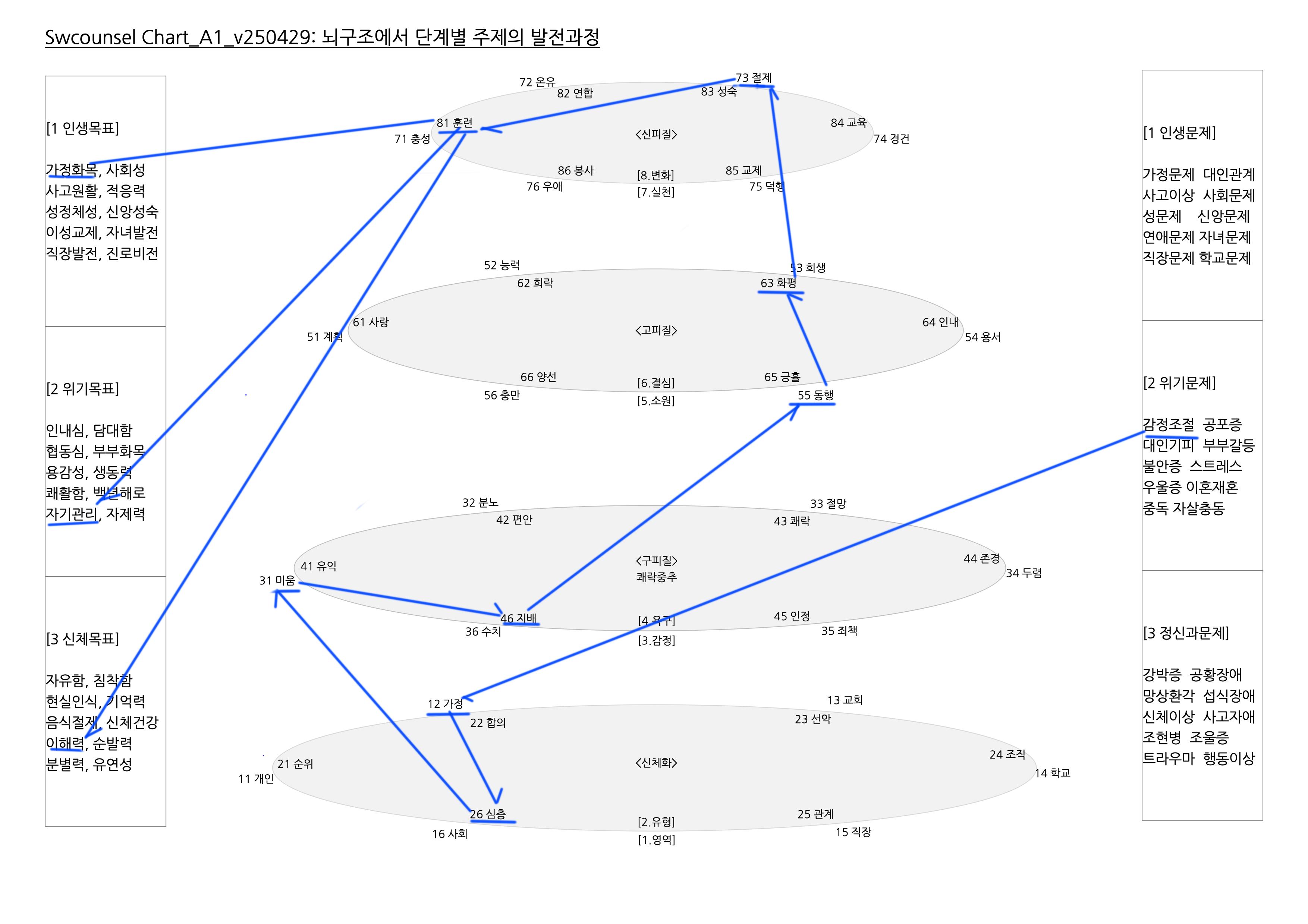 I.단계주제  1. 영역: 가정, 어린 시절부터 가정에서의 삶 힘들었고 현실적인 문제 있어보이는 아빠, 오빠보다 그나마 대화할 수 있는 엄마로 인해 더 힘들어함2. 유형: 선악, 항상 선악에 대한 의식이 있어서 선함으로 나아가려고 하지만 그러지 못해 괴로운 경우가 많음3. 감정: 미움, 자기가 생각하는 옳은 것, 선한 것, 마땅한 것에서 벗어나면 억울하고 절망하게 됨4. 욕구: 편안, 본인의 기준과 생활의 틀에 머무는 것 이외에 모든 것이 불편하게 느껴짐5. 소원: 동행, 힘들 때 나를 도와주고 함께해준 사람들과 하나님을 깨닫고 가족과의 동행, 예수님과의 동행을 소원함6. 결심: 화평, 동행하려는 소원을 할 때 마음의 여러가지 걱정과 감정적인 괴로움이 자연스레 멀어지며 잊혀짐 7. 실천: 절제, 욕구와 소원을 구별하고 목표와 선순환을 의식적으로 떠올리며 그렇게 나아가도록 애쓴다 8. 변화: 교제, 여러가지 불편함과 두려움으로 인해 상대방의 접근을 막던 모습에서 벗아나 사람들과 소통하고 생활함 II.사례해석1. 악순환: 과거부터 계속된 안 좋은 사건들과 그로인한 이해되지 못한 감정들로 인해 불편하게 느껴졌던 엄마를 미워하고 자신이 만든 틀의 정당성에 갖혀서 신앙의 자유함을 잃어버림, 존경 욕구로 인해 대인기피생기고 사람을 두려워 함, 이 모든 것으로 인해 더욱 우울하고 절망함   2. 선순환: 가정에서 엄마와 함께 동행하며, 존경 욕구를 버리고 예수님의 뜻을 따르는 동행을, 신앙적 자유함을 얻기 위해 율법에서 해방시키신 성령님의 동행하심을 더욱 소원함 3. 진입구: 신앙을 의지하려는 마음과 어려움을 성경으로 해석하고 이해하려는 마음, 선으로 나아가고자 하는 마음으로 들어감4. 상담방향: 이제까지 힘들때 도와줬던 사람들, 좋아해줬던 사람들과 그 은혜를 허락하신 하나님을 깨달음 5. 상담계획: 편안하려는 마음을 내려놓고 동행을 소원하게 함6. 상담목표: 가정에서의 인내함을 얻고, 신앙에서의 자유함을 얻고…