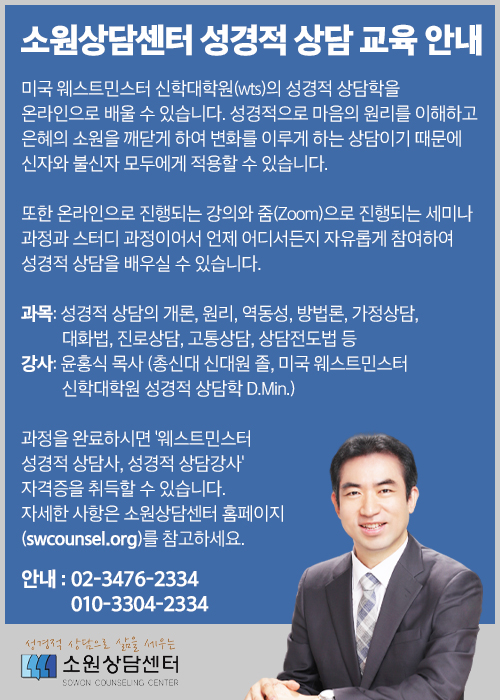 [광고] 크리스찬 투데이 사이트에 성경적 상담 세미나 광고가 나왔습니다.![]() 5월을 맞이해서 소원상담센터 광고를 인터넷, 종이 신문인 크리스찬 투데이에 게재했습니다. 크리스챤들이 성경적인 원리를 삶 속에 적용하는 성경적 상담을 더 많이 알고 변화된 삶을 살게 되기를 기원합니다. 상담칼럼도 함께 수록되었는데 심리 상담이 아닌 성경적 상담에 대한 관심이 높아질 수 있기를 기대해 봅니다.