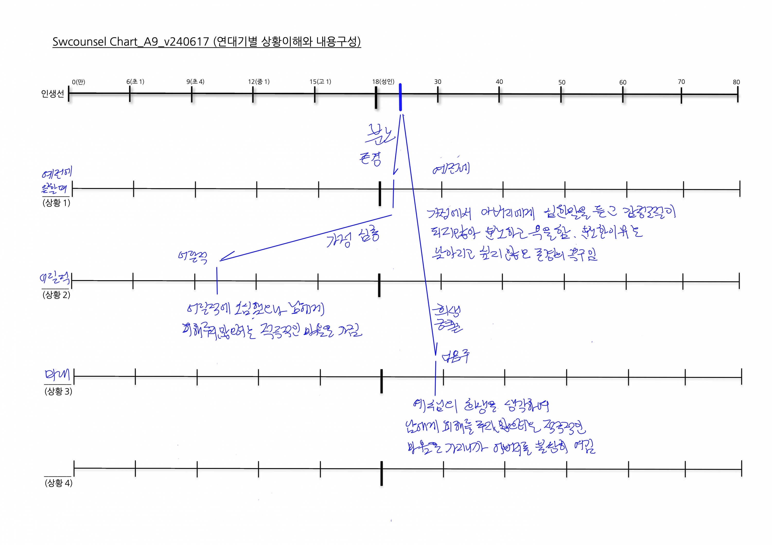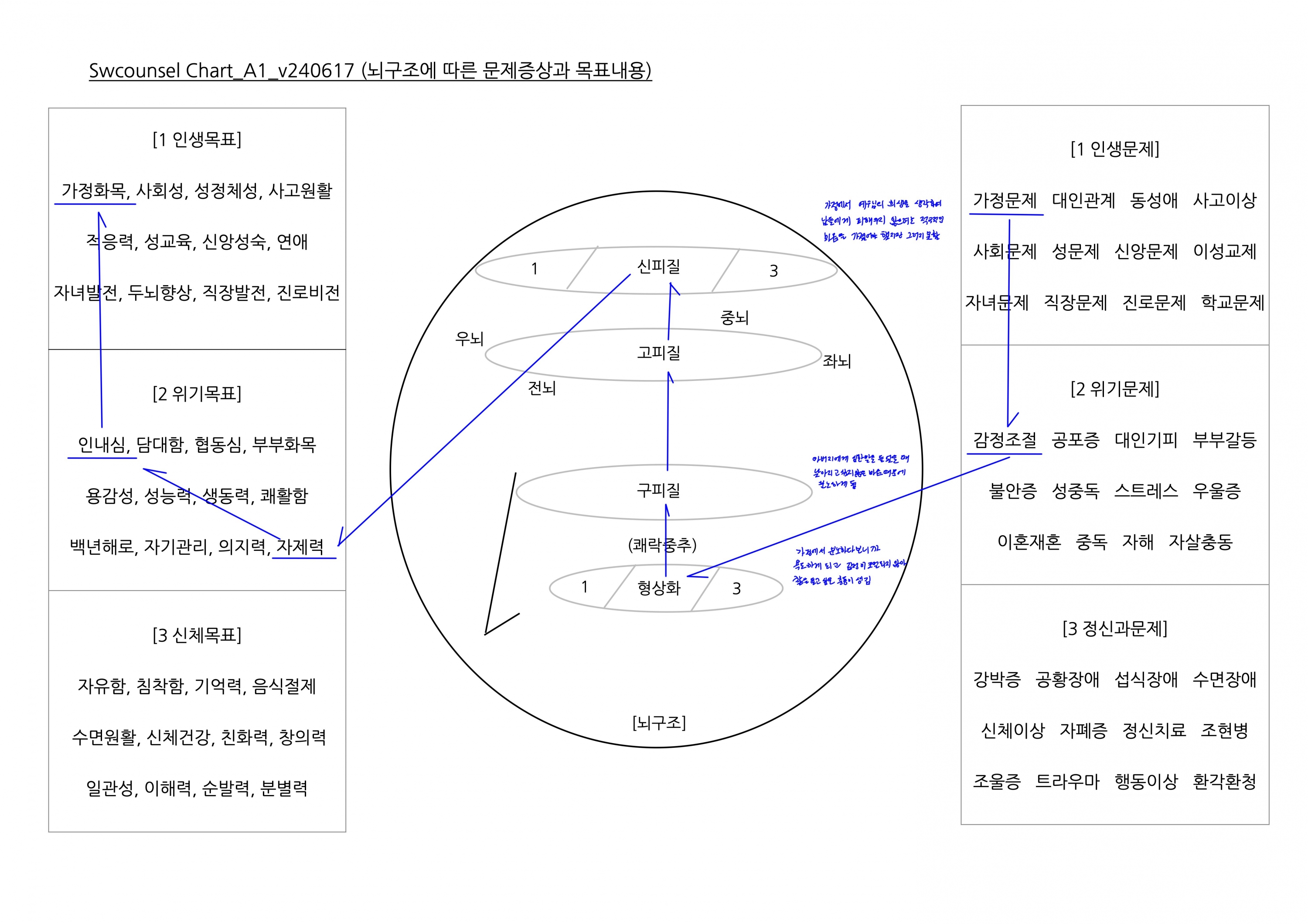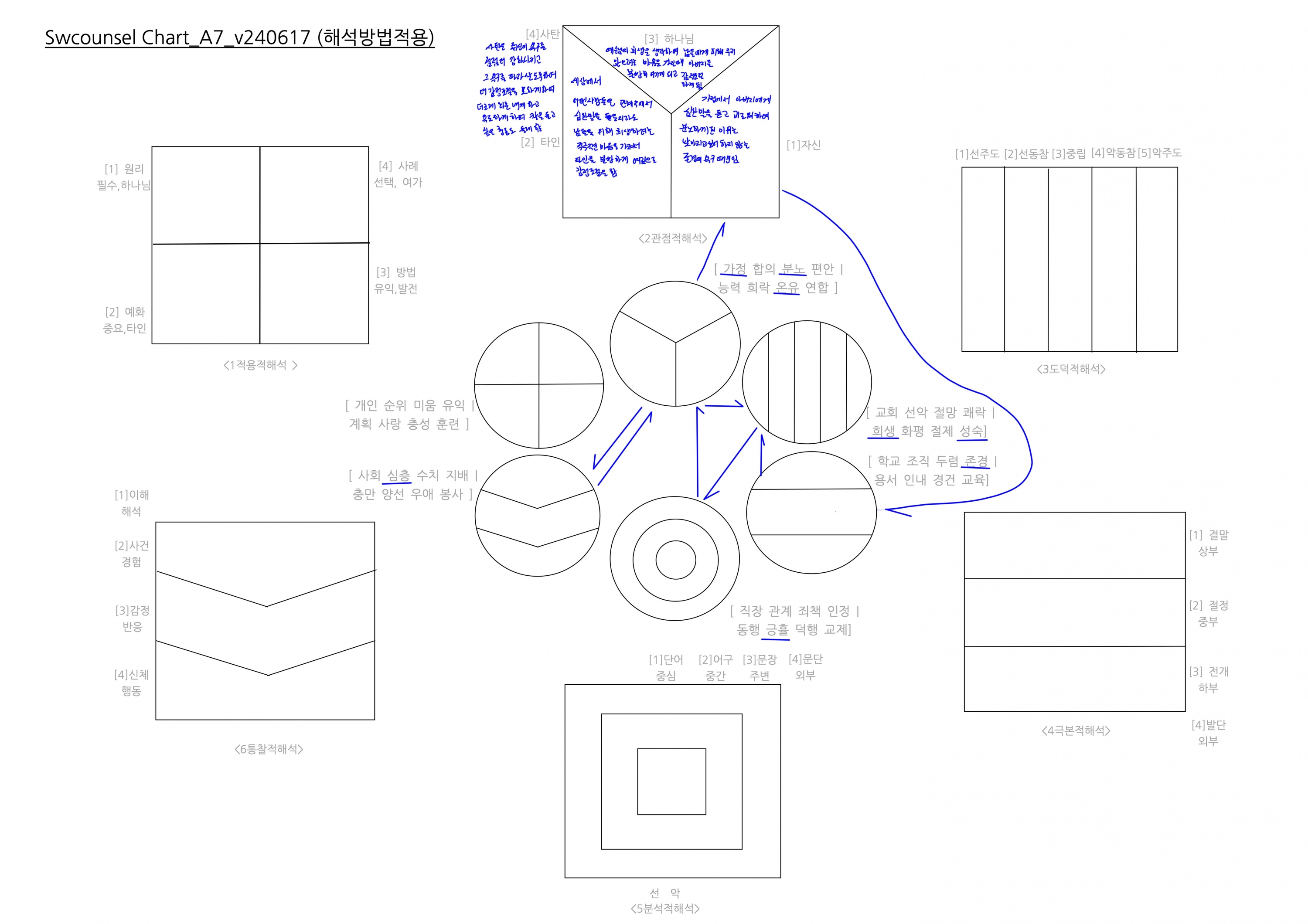 2]사례해석 1) 악순환: 가정에서 아버지가 심한말을 자신에게 했을 때 자신을 낮추는 말에 대해 견디지 못하게 하는 존경의 욕구로 인해 분노하게 되었다. 그 결과 욕을 하고 상대방에게 소리를 지를뿐만 아니라 칼을들고 싶은 마음까지 생기게 되었다. 그리고 다른 공적인 자리에서도 분노를 조절하지 못할것에 대한 염려가 생기게 되었다. 2) 선순환: (예수님의 희생을 생각 하여 남에게 희생하려는 적극적인 마음을 가지다 보니까) 아버지를 볼 때 불쌍한 마음을 갖게 되고 그런 시선으로 아버지를 볼 때 아버지가 심한말을 할지라도 온유하게 대응하게 되고 그렇게 성숙한 반응을 하다보니까 분노를 조절하여 발전된 삶을 살게 된다. 3) 진입구: 아버지에게 화를 내는 상황을 힘들어 하면서 다른 삶의 영역에서도 이성을 잃어 분노할까봐 걱정하는 마음이 있으니 그걸 이번에 해결 할 수 있다고 이야기 해준다. 4) 상담방향: 가정에서 아버지에게 이성을 잃고 분노했던 이유가 자신이 심한말을 들었을때 낮아지고 싶어하지 않는 존경의 욕구에서 비롯된 것임을 알게 해준다. 5) 상담계획: 존경의 욕구를 버리고 (예수님의 희생을 생각하여 남들에게 피해주지 않으려는 적극적인 마음을 가질때) 아버지를 불쌍히 여길 수 있게 되고 다시 심한말을 할지라도 온유하게 대처할 수 있게 된다. 6) 상담목표: (예수님의 희생을 생각하면서 남들을 위해 희생하려는 적극적인 마음을 가져서) 아버지를 불쌍히 여기며 앞으로 심한말을 할지라도 온유하게 대응하여 앞으로 계속 이렇게 성숙한 삶을 살아가게 한다.