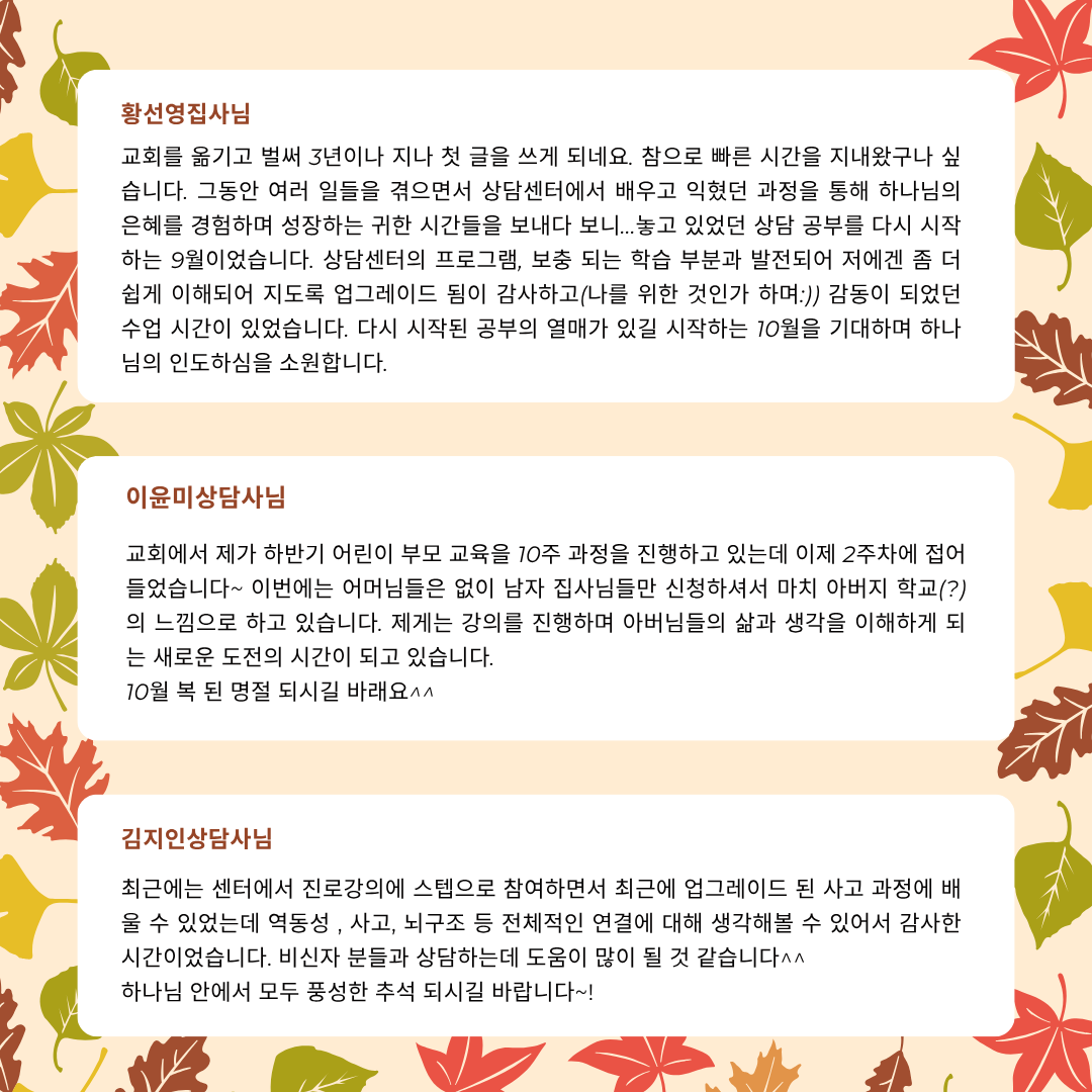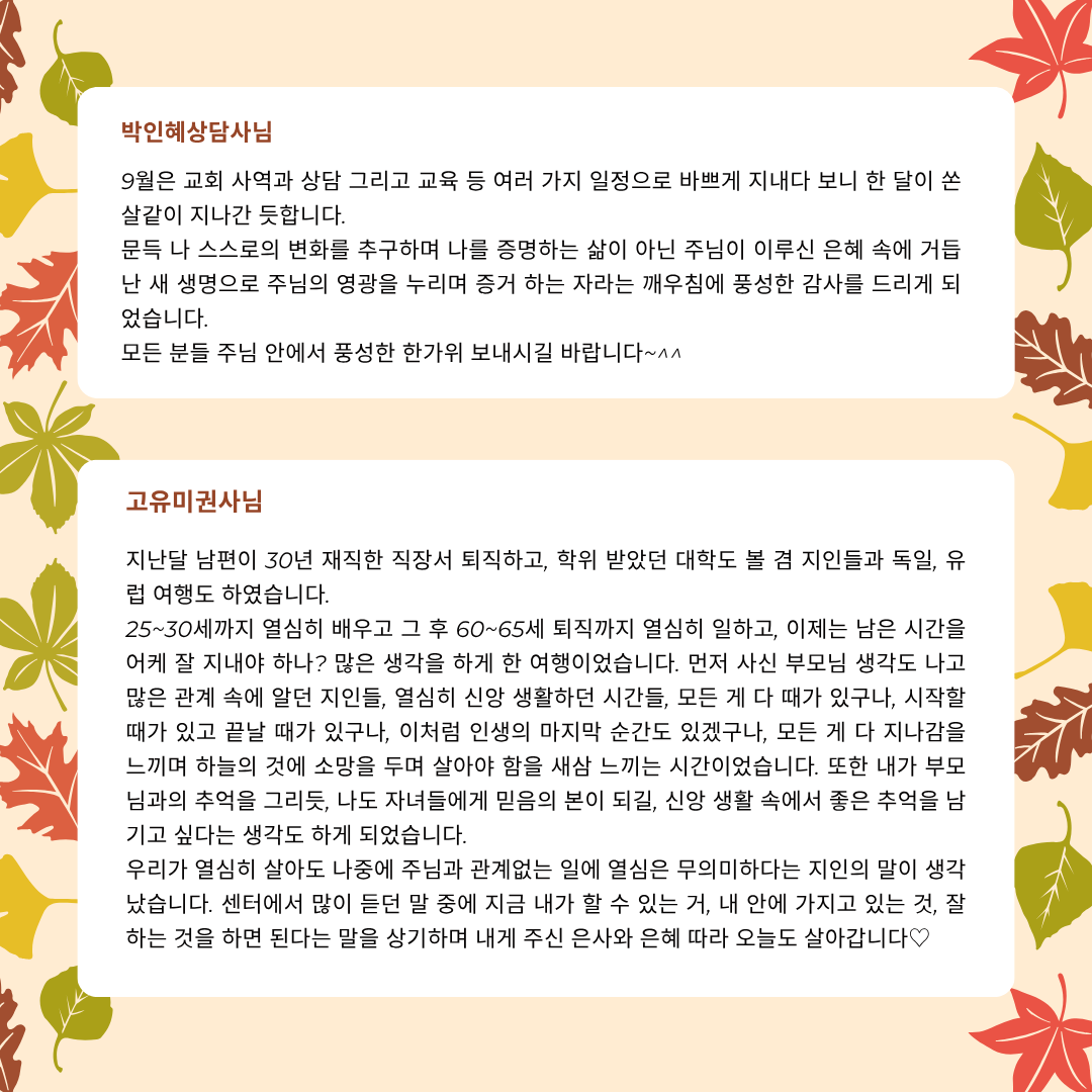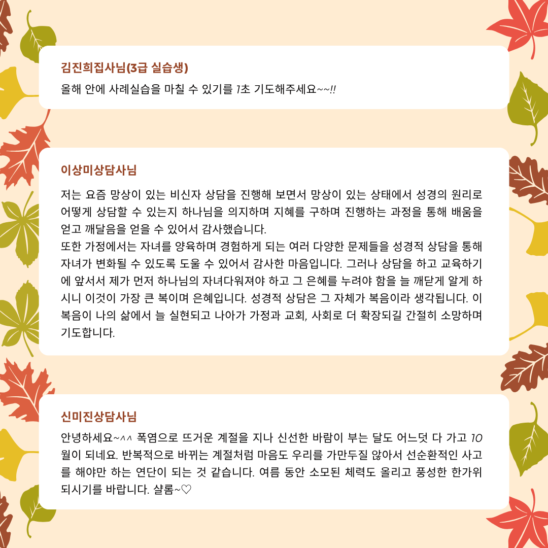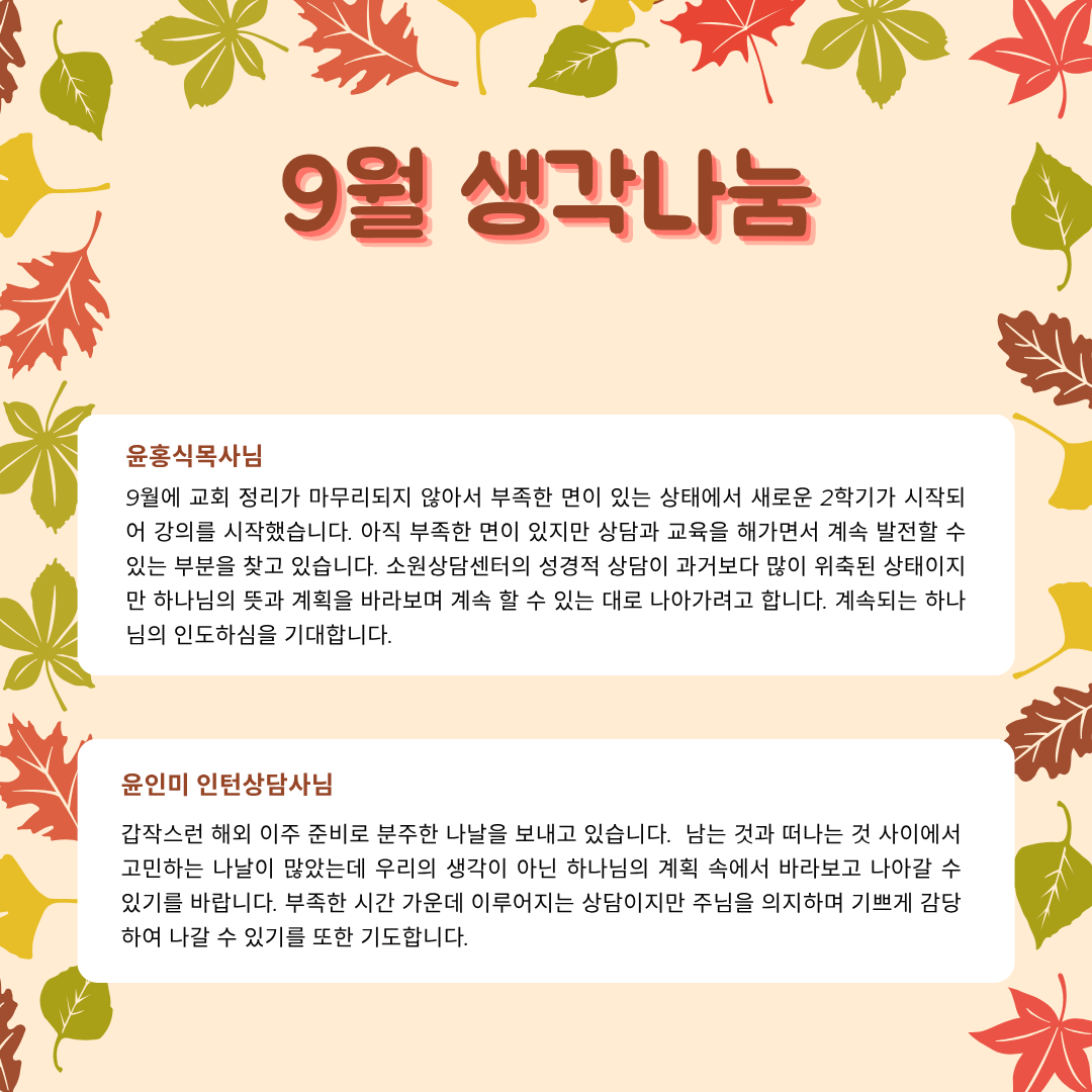 [학생근황] 소원상담센터 생각나눔 2025년 9월![]() ![]() ![]() ![]() 9월 근황 윤홍식목사님 9월에 교회정리가 마무리되지 않아서 부족한 면이 있는 상태에서 새로운 2학기가 시작되어 강의를 시작했습니다. 아직 부족한 면이 있지만 상담과 교육을 해가면서 계속 발전할 수 있는 부분을 찾고 있습니다. 소원상담센터의 성경적 상담이 과거보다 많이 위축된 상태이지만 하나님의 뜻과 계획을 바라보며 계속 할 수 있는 대로 나아가려고 합니다. 계속되는 하나님의 인도하심을 기대합니다. 윤인미 인턴상담사님 갑작스런 해외이주준비로 분주한 나날을 보내고 있습니다. 남는 것과 떠나는 것 사이에서 고민하는 나날이 많았는데 우리의 생각이 아닌 하나님의 계획속에서 바라보고 나아갈 수 있기를 바랍니다. 부족한 시간가운데 이루어지는 상담이지만 주님을 의지하며 기쁘게 감당하여 나갈 수 있기를 또한 기도합니다. 박인혜상담사님 9월은 교회 사역과 상담 그리고 교육 등 여러 가지 일정으로 바쁘게 지내다 보니 한 달이 쏜살같이 지나간 듯합니다. 문득 나 스스로의 변화를 추구하며 나를 증명하는 삶이 아닌 주님이 이루신 은혜 속에 거듭난 새 생명으로 주님의 영광을 누리며 증거 하는 자라는 깨우침에 풍성한 감사를 드리게 되었습니다. 모든 분들 주님 안에서 풍성한 한가위 보내시길 바랍니다~^^ 고유미권사님 지난달 남편이 30년 재직한 직장서 퇴직하고, 학위 받았던 대학도 볼 겸 지인들과 독일, 유럽 여행도 하였습니다. 25~30세까지 열심히 배우고 그 후 60~65세 퇴직까지 열심히 일하고, 이제는 남은 시간을 어케 잘 지내야 하나? 많은 생각을 하게 한 여행이었습니다. 먼저 사신 부모님 생각도 나고 많은 관계 속에 알던 지인들, 열심히 신앙 생활하던 시간들, 모든 게 다 때가 있구나, 시작할 때가 있고 끝날 때가 있구나, 이처럼 인생의 마지막 순간도 있겠구나, 모든 게 다 지나감을 느끼며 하늘의 것에 소망을 두며 살아야 함을 새삼 느끼는 시간이었습니다. 또한 내가 부모님과의 추억을 그리듯, 나도 자녀들에게 믿음의 본이 되길, 신앙 생활 속에서 좋은 추억을 남기고 싶다는 생각도 하게 되었습니다. 우리가 열심히 살아도 나중에 주님과 관계없는 일에 열심은 무의미하다는 지인의 말이 생각났습니다. 센터에서 많이 듣던 말 중에 지금 내가 할 수 있는 거, 내 안에 가지고 있는 것, 잘하는 것을 하면 된다는 말을 상기하며 내게 주신 은사와 은혜 따라 오늘도 살아갑니다♡ 김진희집사님(3급 상담 실습생) 올해 안에 사례실습을 마칠수 있기를 1초 기도해주세요~~!! 이상미상담사님 저는 요즘 망상이 있는 비신자 상담을 진행해 보면서 망상이 있는 상태에서 성경의 원리로 어떻게 상담할 수 있는지 하나님을 의지하며 지혜를 구하며 진행하는 과정을 통해 배움을 얻고 깨달음을 얻을 수 있어서 감사했습니다. 또한 가정에서는 자녀를 양육하며 경험하게 되는 여러 다양한 문제들을 성경적 상담을 통해 자녀가 변화될 수 있도록 도울 수 있어서 감사한 마음입니다. 그러나 상담을 하고 교육하기에 앞서서 제가 먼저 하나님의 자녀다워져야 하고 그 은혜를 누려야 함을 늘 깨닫게 알게 하시니 이것이 가장 큰 복이며 은혜입니다. 성경적 상담은 그 자체가 복음이라 생각됩니다. 이 복음이 나의 삶에서 늘 실현되고 나아가 가정과 교회, 사회로 더 확장되길 간절히 소망하며 기도합니다. 신미진상담사님 안녕하세요~^^ 폭염으로 뜨거운 계절을 지나 신선한 바람이 부는 달도 어느덧 다 가고 10월이 되네요. 반복적으로 바뀌는 계절처럼 마음도 우리를 가만두질 않아서 선순환적인 사고를 해야만 하는 연단이 되는 것 같습니다. 여름 동안 소모된 체력도 올리고 풍성한 한가위 되시기를 바랍니다. 샬롬~♡ 황선영집사님 교회를 옮기고 벌써 3년이나 지나 첫 글을 쓰게 되네요. 참으로 빠른 시간을 지내왔구나 싶습니다. 그동안 여러 일들을 겪으면서 상담센터에서 배우고 익혔던 과정을 통해 하나님의 은혜를 경험하며 성장하는 귀한 시간들을 보내다 보니...놓고 있었던 상담 공부를 다시 시작하는 9월이었습니다. 상담센터의 프로그램, 보충 되는 학습 부분과 발전되어 저에겐 좀 더 쉽게 이해되어 지도록 업그레이드 됨이 감사하고(나를 위한 것인가 하며:)) 감동이 되었던 수업 시간이 있었습니다. 다시 시작된 공부의 열매가 있길 시작하는 10월을 기대하며 하나님의 인도하심을 소원합니다. 이윤미상담사님 교회에서 제가 하반기 어린이 부모교육을 10주 과정을 진행하고 있는데 이제 2주차에 접어들었습니다~ 이번에는 어머님들은 없이 남자 집사님들만 신청하셔서 마치 아버지 학교(?)의 느낌으로 하고 있습니다. 제게는 강의를 진행하며 아버님들의 삶과 생각을 이해하게 되는 새로운 도전의 시간이 되고 있습니다. 10월 복된 명절 되시길 바래요^^ 김지인상담사님 최근에는 센터에서 진로강의에 스텝으로 참여하면서 최근에 업그레이드 된 사고 과정에 배울 수 있었는데 역동성 , 사고, 뇌구조 등 전체적인 연결에 대해 생각해볼 수 있어서 감사한 시간이었습니다. 비신자 분들과 상담하는데 도움이 많이 될 것 같습니