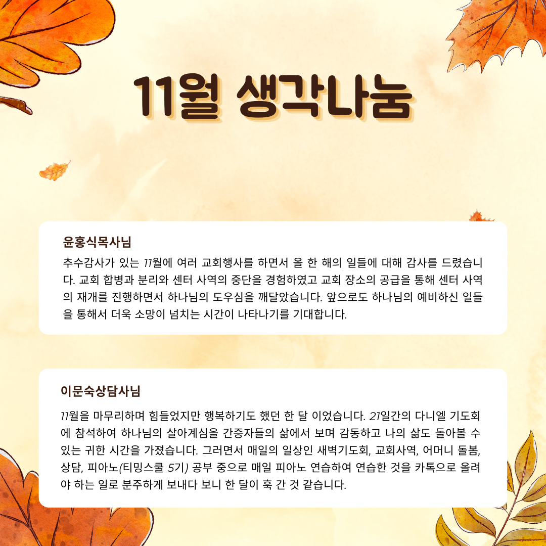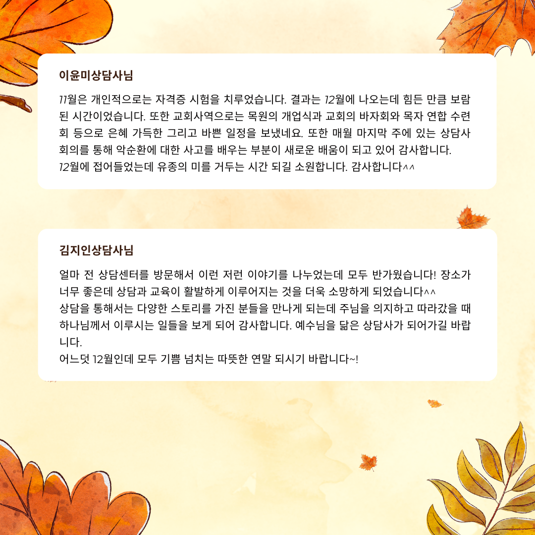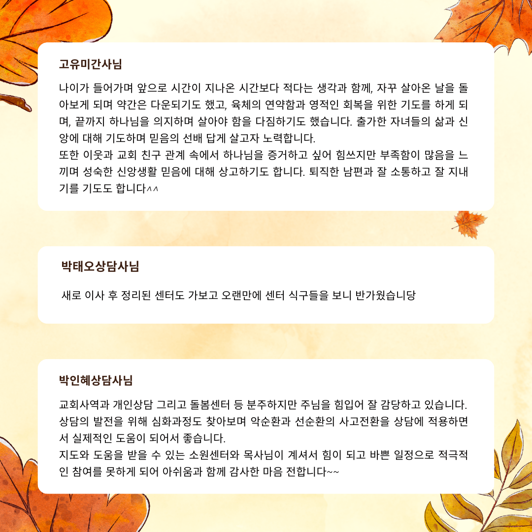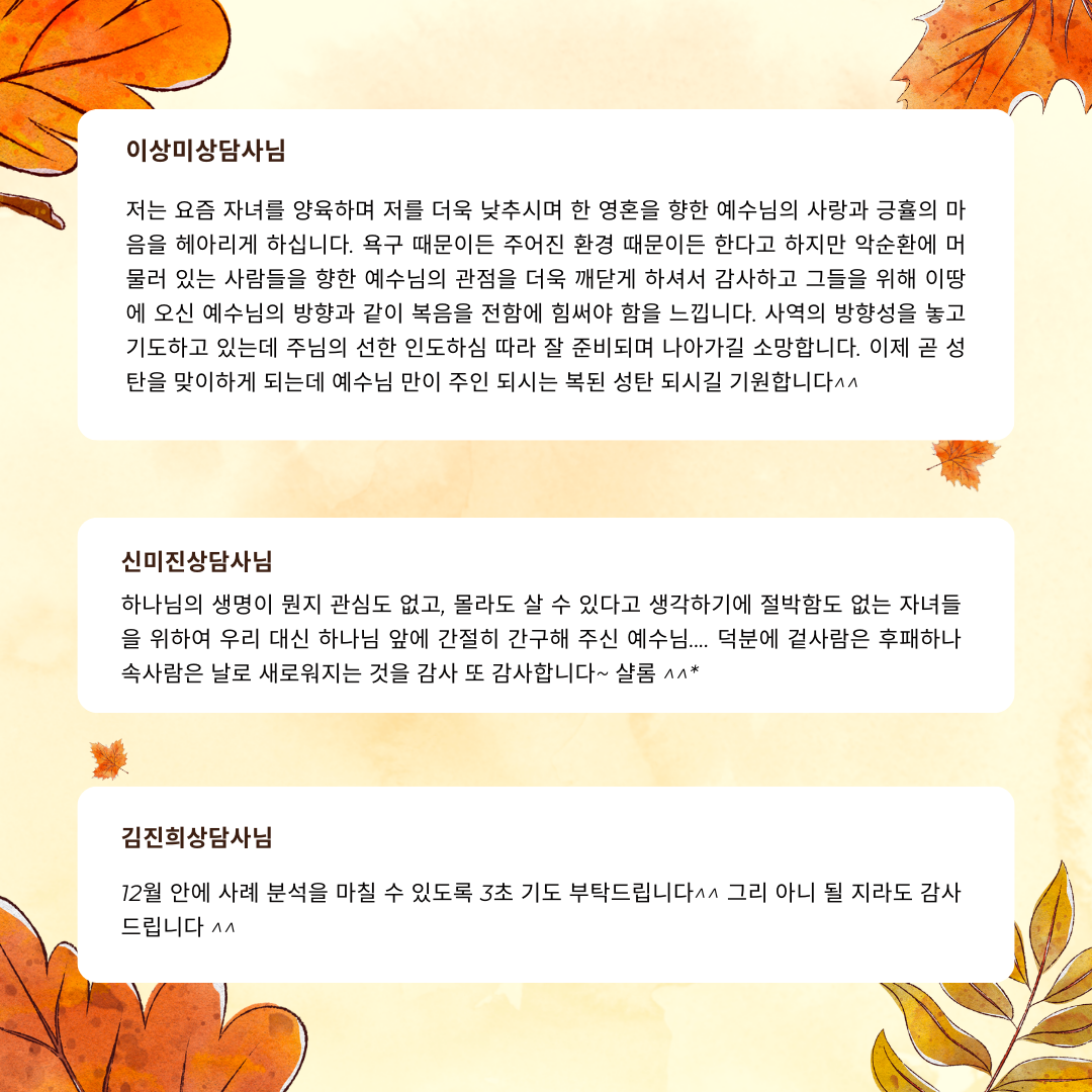 [학생근황] 소원상담센터 생각나눔 2025년 11월![]() ![]() ![]() ![]() 11월 근황 윤홍식원장님 추수감사가 있는 11월에 여러 교회행사를 하면서 올 한해의 일들에 대해 감사를 드렸습니다. 교회합병과 분리와 센터사역의 중단을 경험하였고 교회 장소의 공급을 통해 센터사역의 재개를 진행하면서 하나님의 도우심을 깨달았습니다. 앞으로도 하나님의 예비하신 일들을 통해서 더욱 소망이 넘치는 시간이 나타나기를 기대합니다. 이문숙상담사님 11월을 마무리하며 힘들었지만 행복하기도 했던 한 달 이었습니다. 21일간의 다니엘기도회에 참석하여 하나님의 살아계심을 간증자들의 삶에서 보며 감동하고 나의 삶도 돌아볼 수 있는 귀한 시간을 가졌습니다. 그러면서 매일의 일상인 새벽기도회, 교회사역, 어머니 돌봄, 상담, 피아노(티밍스쿨5기) 공부중으로 매일 피아노 연습하여 연습한 것을 카톡으로 올려야 하는 일로 분주하게 보내다 보니 한 달이 훅 간 것 같습니다. 고유미간사님 나이가들어가며 앞으로시간이 지나온시간보다 적다는생각과함께, 자꾸 살아온날을돌아보게돼며 약간은 다운되기도했고, 육체의 연약함과 영적인회복을위한 기도를하게되며, 끝까지 하나님을 의지하며 살아야함을 다짐하기도했습니다, 출가한자녀들의 삶과 신앙에대해 기도하며 믿음의선배답게 살고자 노력합니다. 또한 이웃과 교회 친구관계속에서 하나님을 증거하고싶어 힘쓰지만 부족함이많음을 느끼며 성숙한 신앙생활 믿음에대해 상고하기도합니다, 퇴직한남편과 잘소통하고 잘 지내기를 기도도 합니다^^ 박태오상담사님 새로 이사 후 정리된 센터도 가보고 오랜만에 센터식구들을 보니 반가웠습니당 박인혜상담사님 교회사역과 개인상담 그리고 돌봄센터 등 분주하지만 주님을 힘입어 잘 감당하고 있습니다. 상담의 발전을 위해 심화과정도 찾아보며 악순환과 선순환의 사고전환을 상담에 적용하면서 실제적인 도움이 되어서 좋습니다. 지도와 도움을 받을 수 있는 소원센터와 목사님이 계셔서 힘이 되고 바쁜 일정으로 적극적인 참여를 못하게 되어 아쉬움과 함께 감사한 마음 전합니다~~ 이상미상담사님 저는 요즘 자녀를 양육하며 저를 더욱 낮추시며 한 영혼을 향한 예수님의 사랑과 긍휼의 마음을 헤아리게 하십니다. 욕구 때문이든 주어진 환경 때문이든 한다고 하지만 악순환에 머물러 있는 사람들을 향한 예수님의 관점을 더욱 깨닫게 하셔서 감사하고 그들을 위해 이땅에 오신 예수님의 방향과 같이 복음을 전함에 힘써야 함을 느낍니다. 사역의 방향성을 놓고 기도하고 있는데 주님의 선한 인도하심 따라 잘 준비되며 나아가길 소망합니다. 이제 곧 성탄을 맞이하게 되는데 예수님만이 주인되시는 복된 성탄 되시길 기원합니다^^ 신미진상담사님 하나님의 생명이 뭔지 관심도 없고, 몰라도 살 수 있다고 생각하기에 절박함도 없는 자녀들을 위하여 우리 대신 하나님 앞에 간절히 간구해 주신 예수님.... 덕분에 겉사람은 후패하나 속사람은 날로 새로워지는 것을 감사 또 감사합니다~ 샬롬 ^^* 김진희상담사님 12월 안에 사례분석을 마칠수 있도록 3초 기도부탁드립니다 (크크) 그리 아니될지라도 감사드립니다 ^^ 이윤미상담사님 11월은 개인적으로는 자격증 시험을 치루었습니다. 결과는 12월에 나오는데 힘든 만큼 보람된 시간이었습니다. 또한 교회사역으로는 목원의 개업식과 교회의 바자회와 목자 연합 수련회 등으로 은혜 가득한 그리고 바쁜 일정을 보냈네요. 또한 매월 마지막 주에 있는 상담사 회의를 통해 악순환에 대한 사고를 배우는 부분이 새로운 배움이 되고 있어 감사합니다. 12월에 접어들었는데 유종의 미를 거두는 시간 되길 소원합니다. 감사합니다^^ 김지인상담사님 얼마 전 상담센터를 방문해서 이런 저런 이야기를 나누었는데 모두 반가웠습니다! 장소가 너무 좋은데 상담과 교육이 활발하게 이루어지는 것을 더욱 소망하게 되었습니다^^ 상담을 통해서는 다양한 스토리를 가진 분들을 만나게 되는데 주님을 의지하고 따라갔을 때 하나님께서 이루시는 일들을 보게 되어 감사합니다. 예수님을 닮은 상담사가 되어가길 바랍니다. 어느덧 12월인데 모두 기쁨 넘치는 따뜻한 연말 되시기 바랍니다~!
