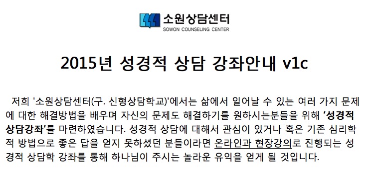 저희 '소원상담센터'에서는 삶에서 일어날 수 있는 여러 가지 문제에 대한 해결방법을 배우며 자신의 문제도 해결하기를 원하시는 분들을 위해 ‘성경적 상담강좌’를 마련하였습니다. 성경적상담에 관심이 있거나 혹은 기존 심리학적 방법으로 좋은 답을 얻지 못하셨던 분들이라면 온라인으로 진행되는 성경적 상담학 강좌를 통해 하나님이 주시는 놀라운 유익을 얻게 될것입니다.