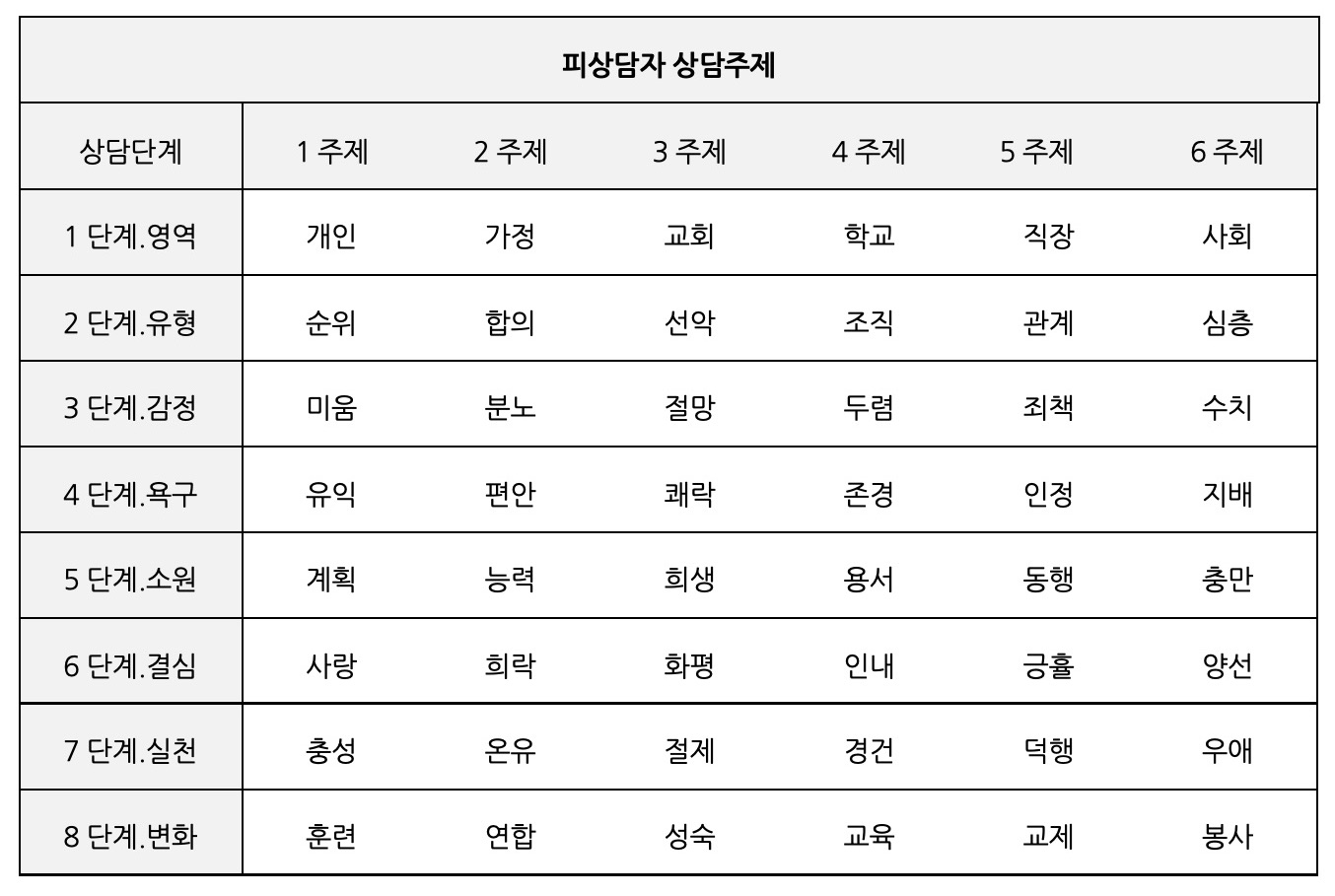 이러한 '상담과정표'와 '인간정신 구조도'를 통해서 성경적 상담을 배우는 일과 성경적 상담을 받는 과정이 이해가 되고 더욱 좋은 선순환을 이루기 위한 도움이 되시기를 바랍니다.